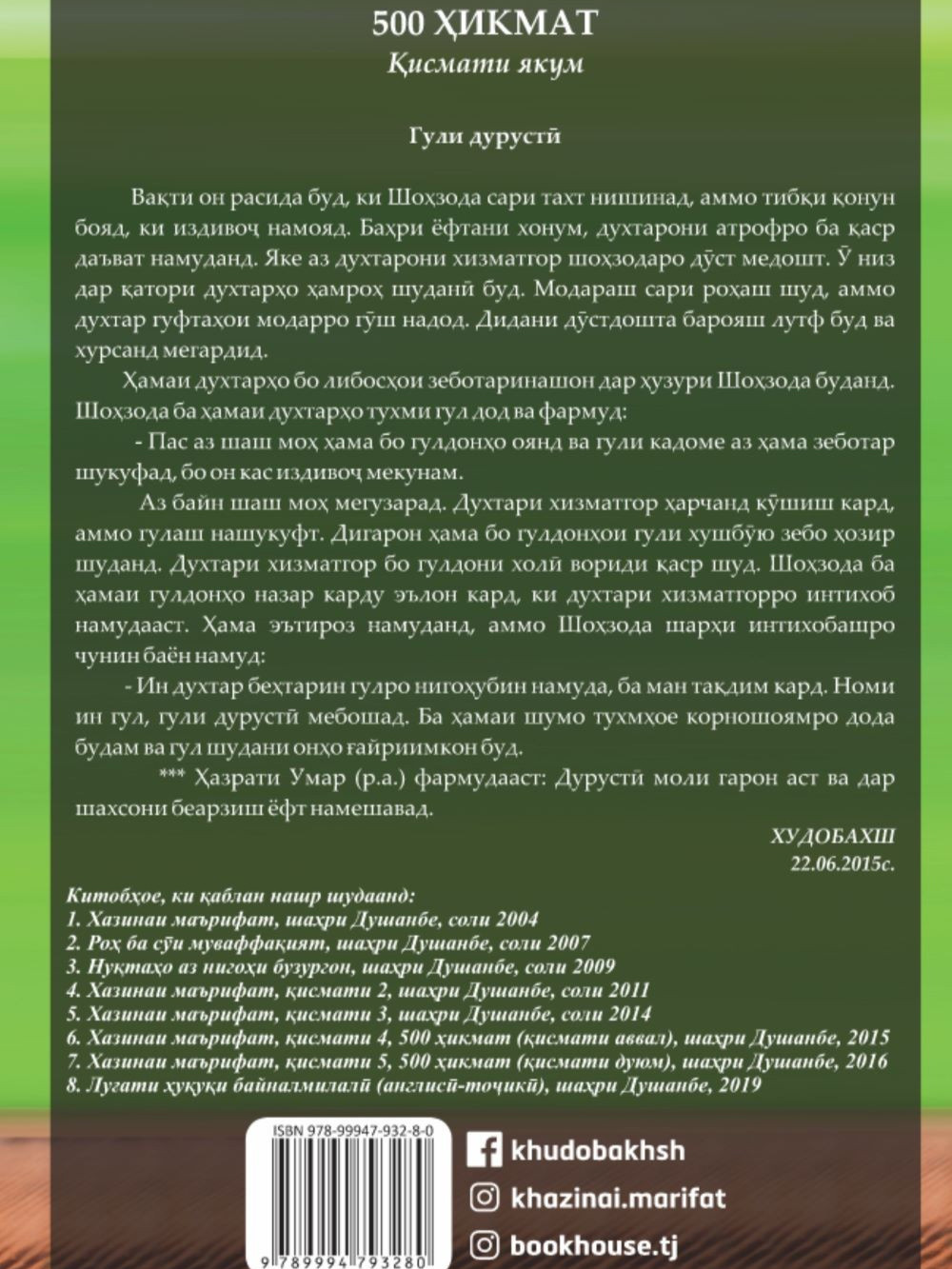 Китоби Хазинаи Маърифат, ки аз 500 ҳикмати тарбиявӣ, панду насиҳатӣ аз қабили паёмбарони илоҳиву азизони Худо ва афроди донишманду ҳаким ва инчунин аз саргузаштҳои ибратбахш бархӯрдор месозад. Ин китобҳо, дар воқеъ, давои дардҳои қалбиву ҷисмӣ (албатта, барои касоне, ки дар сиришташон тухми маърифату садоқат ва муҳаббат кошта шудааст) ва раҳнамое барои оқилону орифон ва ошиқони каломи ҷонбахш аст, ки василае баҳри ноил гаштан ба камолоти ахлоқист.