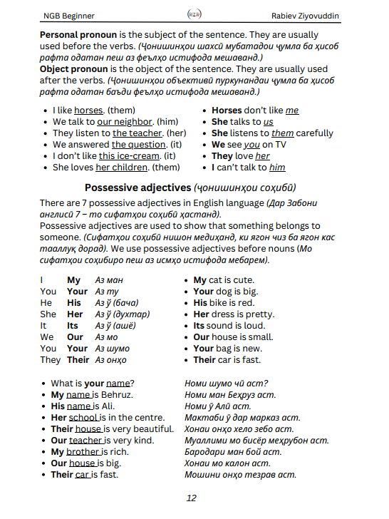 - NGB Beginner (Грамматика) – пособие с объяснениями грамматических правил на английском и таджикском языках, подходящее для изучения и повторения.