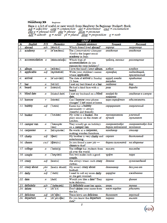 - Wordlist (Список слов) – сборник ключевой лексики с переводами и примерами употребления.