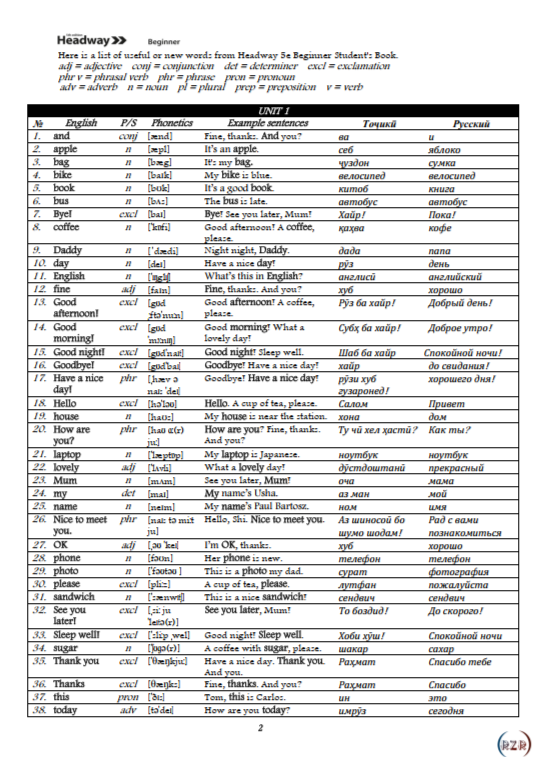 Это словарь, содержащий полезные слова и выражения из учебника "Headway Beginner", включая транскрипцию, примеры использования, а также перевод на русский и таджикский языки.