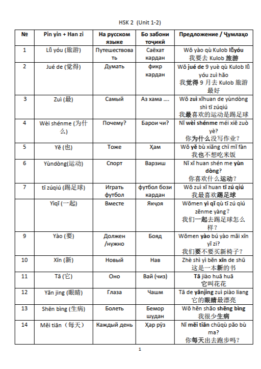 ✔ Слова и выражения с транскрипцией (пиньинь), иероглифами и переводом на русский и таджикский языки.
