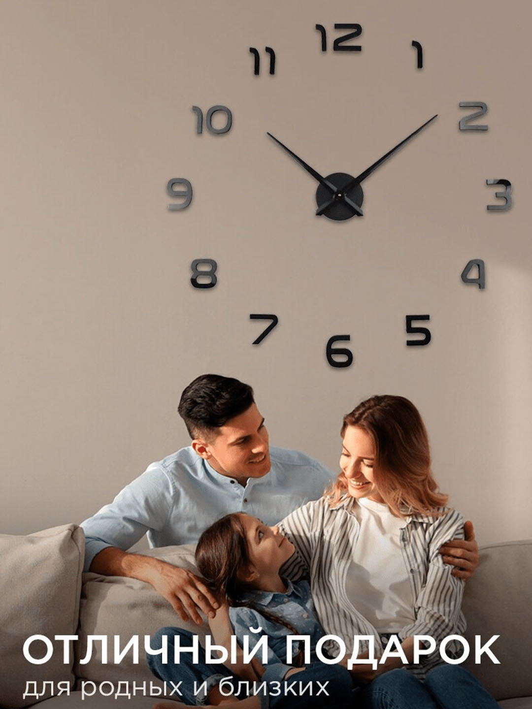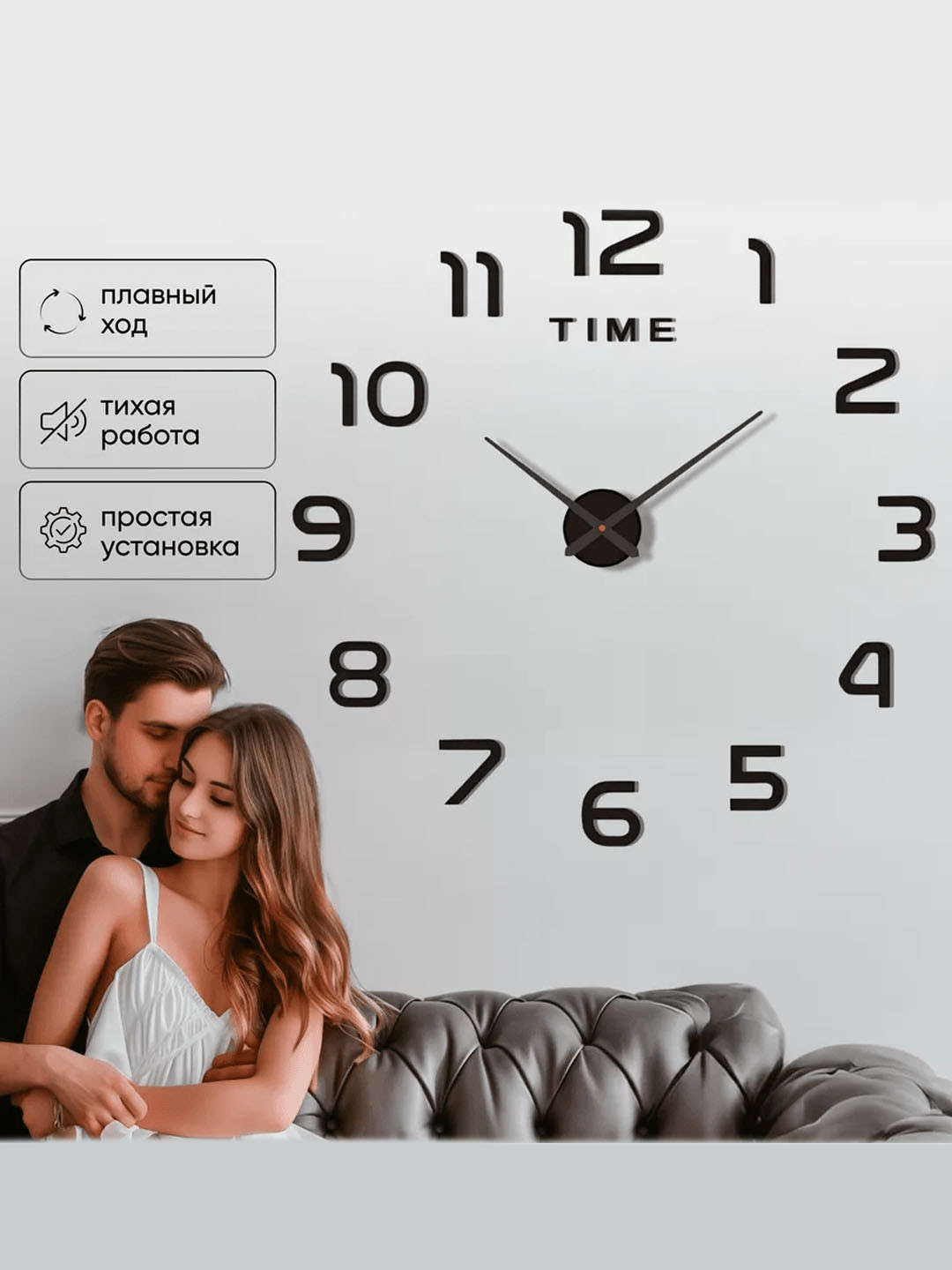 Большие настенные часы дополнят декор и интерьер вашей квартиры и станут отличным подарком близким людям. Часы на стену с бесшумным кварцевым механизмом будут украшением любой комнаты: гостиной, спальни, зала или офиса. Они работают на батарейках, имеют регулируемые размеры циферблата (от 100 до 120 см) и 3д эффект благодаря вспененной основе. Декоративные механические часы дополнят квартиры в стиле лофт или минимализм. В комплекте с кухонными интерьерными часами идет трафарет для удобной разметки стены и наклейки элементов. С его помощью получится правильно разместить части циферблата и стрелки. Элементы часов изготовлены из высокоглянцевого акрилового пластика (ВНИМАНИЕ!) для сохранности на элементах нанесена защитная пленка, которую необходимо снять после установки). На обратной стороне элементов приклеена вспененная основа с клеящим слоем. Вам остается только расположить часы на стене. Клеящий слой позволяет разместить часы на различные поверхности: любые виды обоев, окрашенные, деревянные, пластиковые, керамические или металлические. Центральная чашка с механизмом, выполнена из металла. Стрелки выполнены из алюминия. Длина минутной стрелки - 39см, часовой - 31 см. Настенные часы в гостиную послужат отличным вариантом подарка как для мужчины, так и женщины. Хорошим решением будет подарить своему любимому или любимой на 14 февраля, 23 февраля или 8 марта. Такие необычные и оригинальные настенные часы будут отличным подарком на день рождения бабушке или дедушке. Эти часы на стену самоклеящиеся, поэтому их можно легко прикрепить в прихожей или коридоре. Дизайн этих часов подчеркнет эстетику вашего дома и станет отличным аксессуаром на стенке. Электронные настенные часы - это не только удобно, но и модно. Подарите своим близким не просто часы, подарите им часть вашего тепла и заботы
