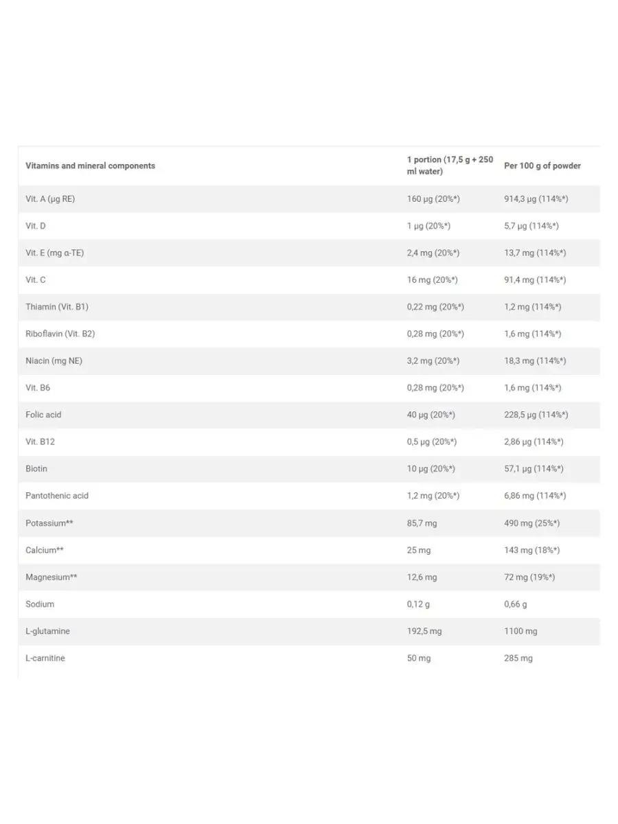 Быстрые углеводы зарядят организм энергией для проведения интенсивной тренировки. Восполняет количество минеральных веществ для предотвращения увеличения вязкости крови. Комплекс содержит глютамин, который входит в состав белка и необходим для эффективного роста мышц и поддержания защитных функций иммунной системы. Изотоник Iso Plus Powder - это: нормализация водного и соляного баланса, источник энергии в виде быстрых углеводов, обеспечение организма глютамином и карнитином, предупреждение появления судорог, защита от обезвоживания, поддержание работоспособности и выносливости, подавление усталости и утомляемости. Смешать 17,5 г порошка (2 ст.л. без горки) с 250 мл воды и пить по мере необходимости, в особенности во время соревнований и тяжелых физических нагрузок. Питательная ценность (1 порция): Калорийность 61,2 ккал, Протеины 0 г, Углеводы 15,3 г, Жир 0 г. Не рекомендуем использовать БАД лицам, не достигшим 18 лет.