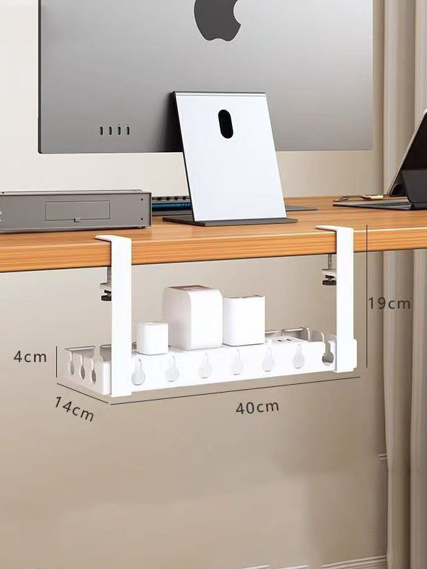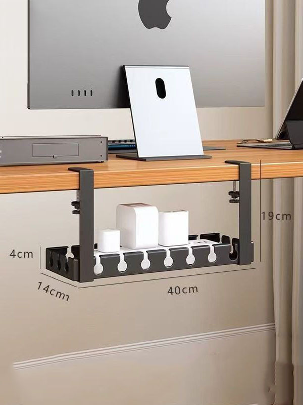 Удобный и стильный органайзер для кабелей, предназначенный для установки под столом, помогает поддерживать порядок и минимизировать беспорядок проводов. Он оснащён креплениями для фиксации к столешнице и обеспечивает легкий доступ к розеткам, зарядным устройствам и маршрутизаторам.