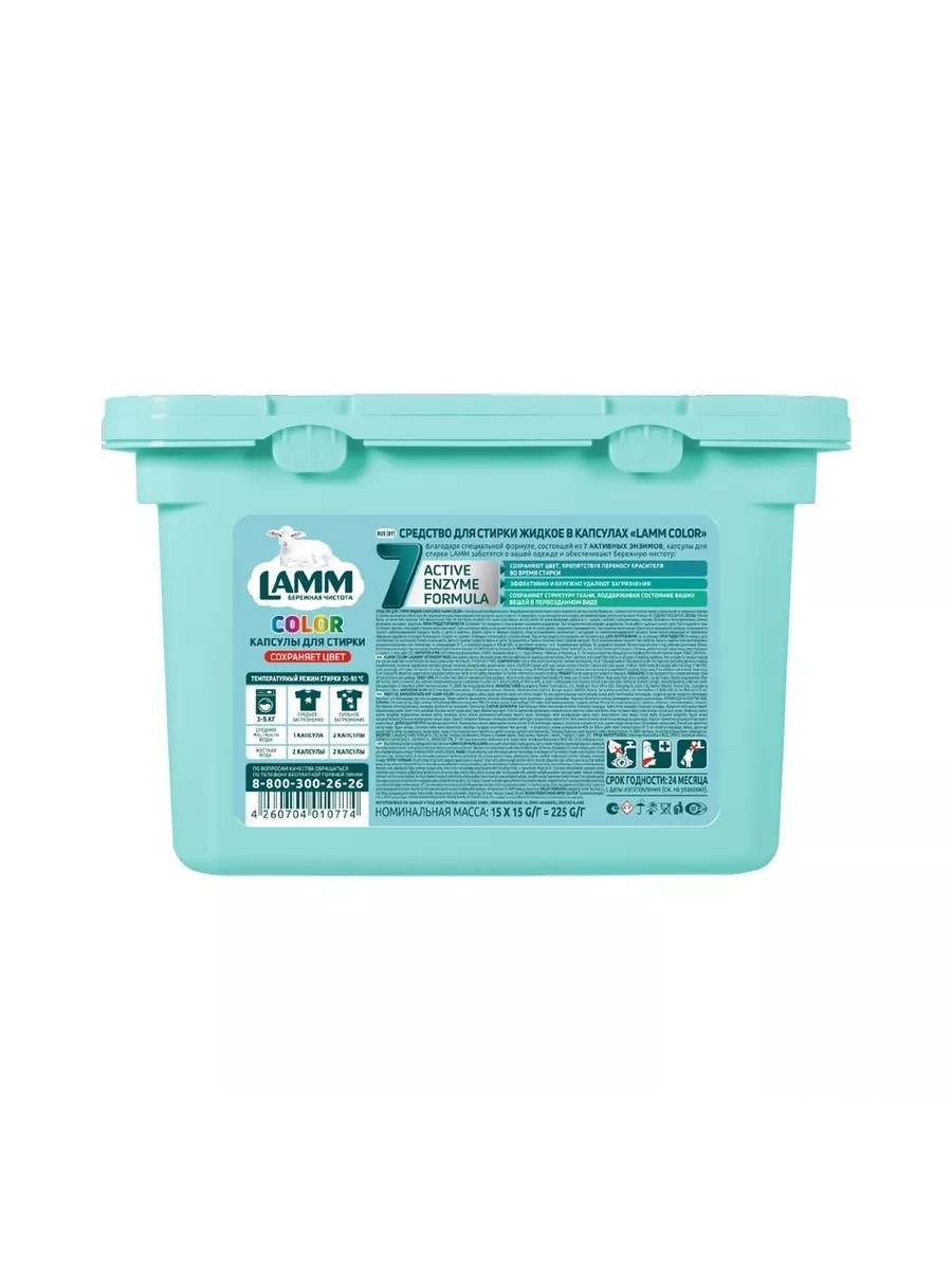 Капсулы для стирки Lamm "Color", сохраняет цвет, 15 шт. Гипоаллергенные капсулы для стирки Lamm Color All in 1 с пониженным пенообразованием и биодобавками эффективно и бережно отстирывают белые и цветные изделия из хлопчатобумажных, льняных и синтетических тканей, а также тканей из смешанных волокон в стиральных машинах любого типа. Особая 7 - ми компонентная формула эффективно удаляет широкий спектр многослойных пятен, включая масляные, жирные, липкие, белковые и крахмальные пятна. Входящие в состав энзимы глубоко проникают в волокна ткани, высвобождают частицы грязи и возвращают живой цвет любимым вещам, гарантируя высокое качество стирки. Средство устраняет любые неприятныее запахи и ухаживает за тканями, благодаря чему одежда и белье становятся не только чистыми, но и приятными на ощупь. Не содержит фосфатов. Материал: Пластик; Срок годности: 18; Состав: 15% или более, но менее 30%: анионные ПАВ, неионогенные ПАВ, 5% или более, но менее 15%: мыло (соли жирных кислот), менее 5%: ароматизирующая добавка гераниол, бутилфенил метилпропиональ, цитронеллол, эвгенол, изоэвгенол, кумарин, энзимы, фосфонаты, оптический отбеливатель, консервант, красители; Класс опасности: Не опасен;