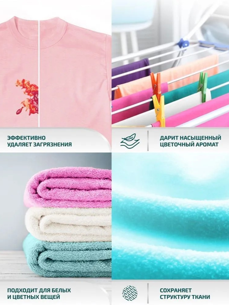 • Средство ухаживает за тканями, благодаря чему одежда и белье становятся не только чистыми, но и приятными на ощупь.