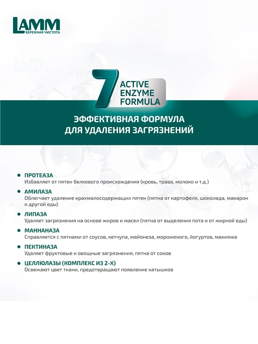 • Входящие в состав энзимы глубоко проникают в волокна ткани, высвобождают частицы грязи и возвращают живой цвет любимым вещам, гарантируя высокое качество стирки.