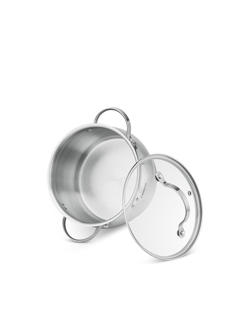 Кастрюля Fissman объёмом 1,9 л изготовлена из высококачественной пищевой нержавеющей стали 18/10. Трёхслойное дно с алюминиевым сердечником обеспечивает быстрый и равномерный прогрев, сохраняя тепло дольше. Стеклянная крышка позволяет контролировать процесс готовки без потери тепла и влаги. Эргономичные ручки остаются слегка тёплыми даже при нагреве.