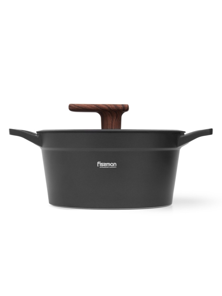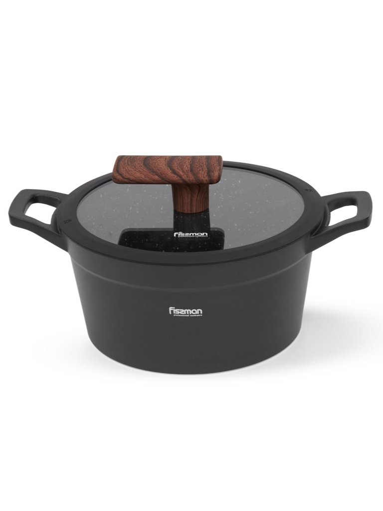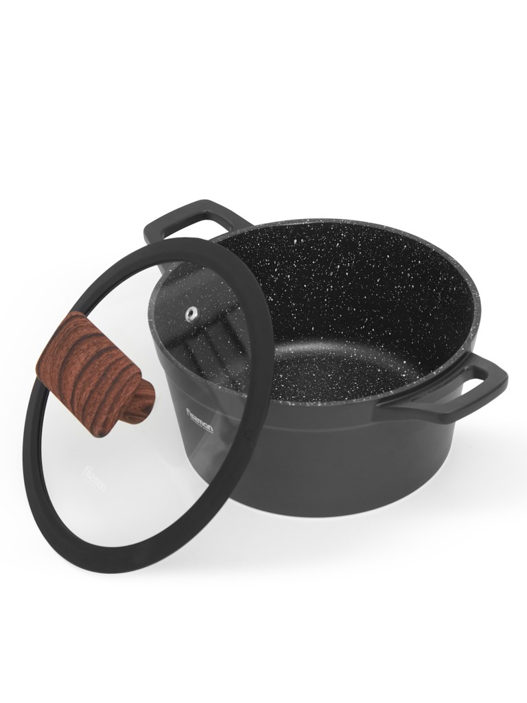 Кастрюля оснащена удобными литыми ручками и стеклянной крышкой с силиконовым ободом и стильной термостойкой ручкой «под дерево».