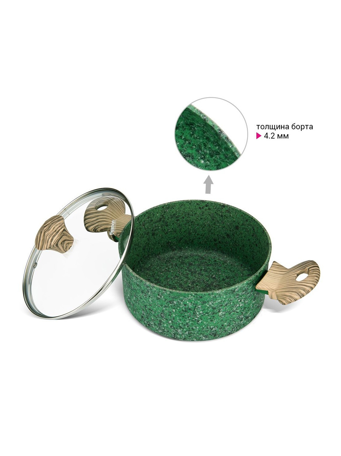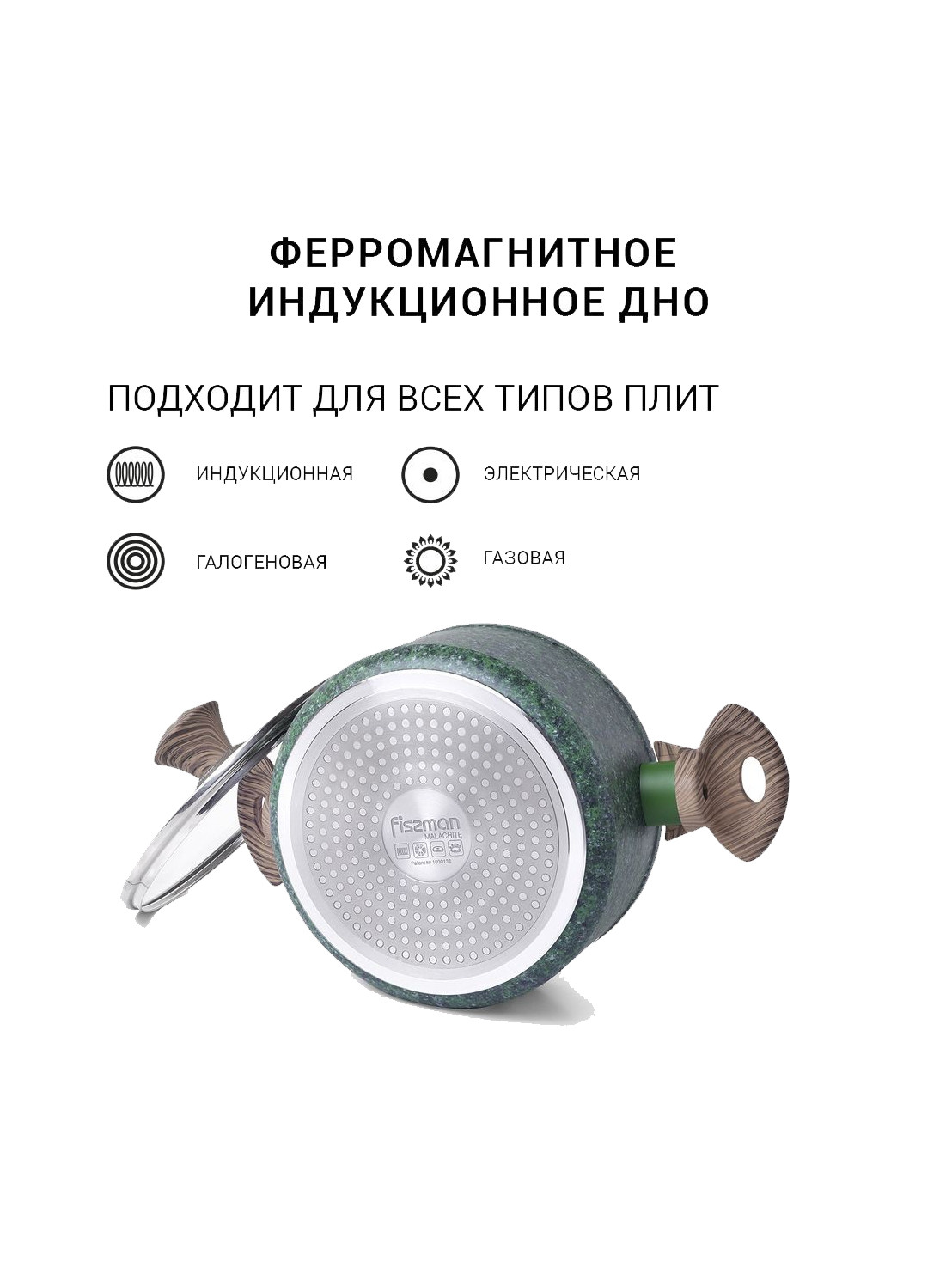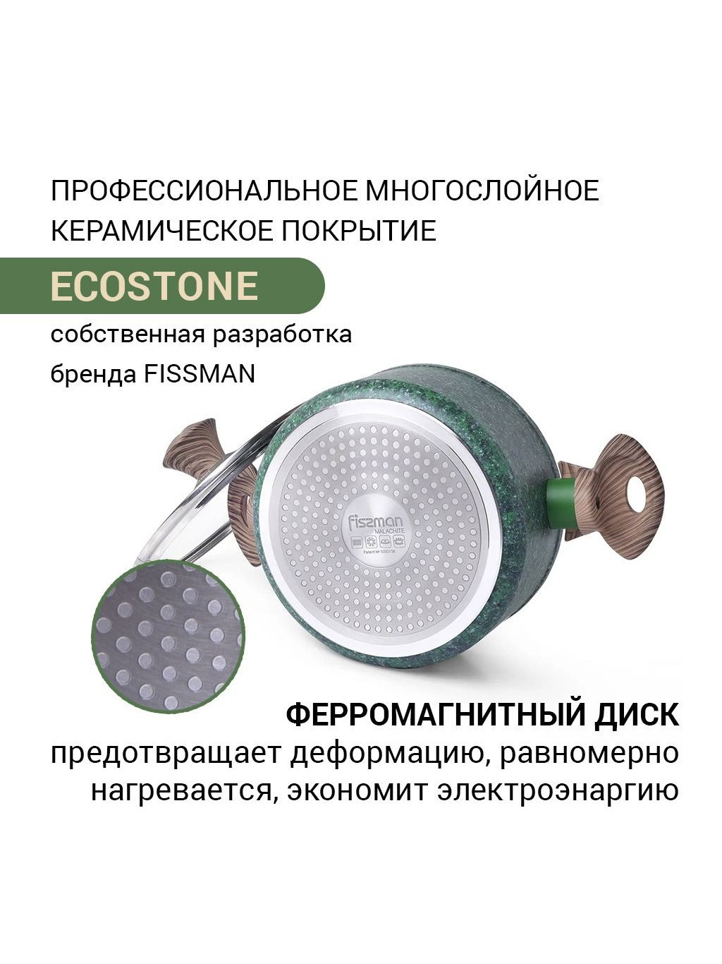 Fissman Malachite — это прочная и стильная кастрюля с многослойным керамическим покрытием ECOSTONE, разработанным специально для интенсивного использования. Подходит для всех типов плит, включая индукционные. Идеальна для варки, тушения и приготовления супов.