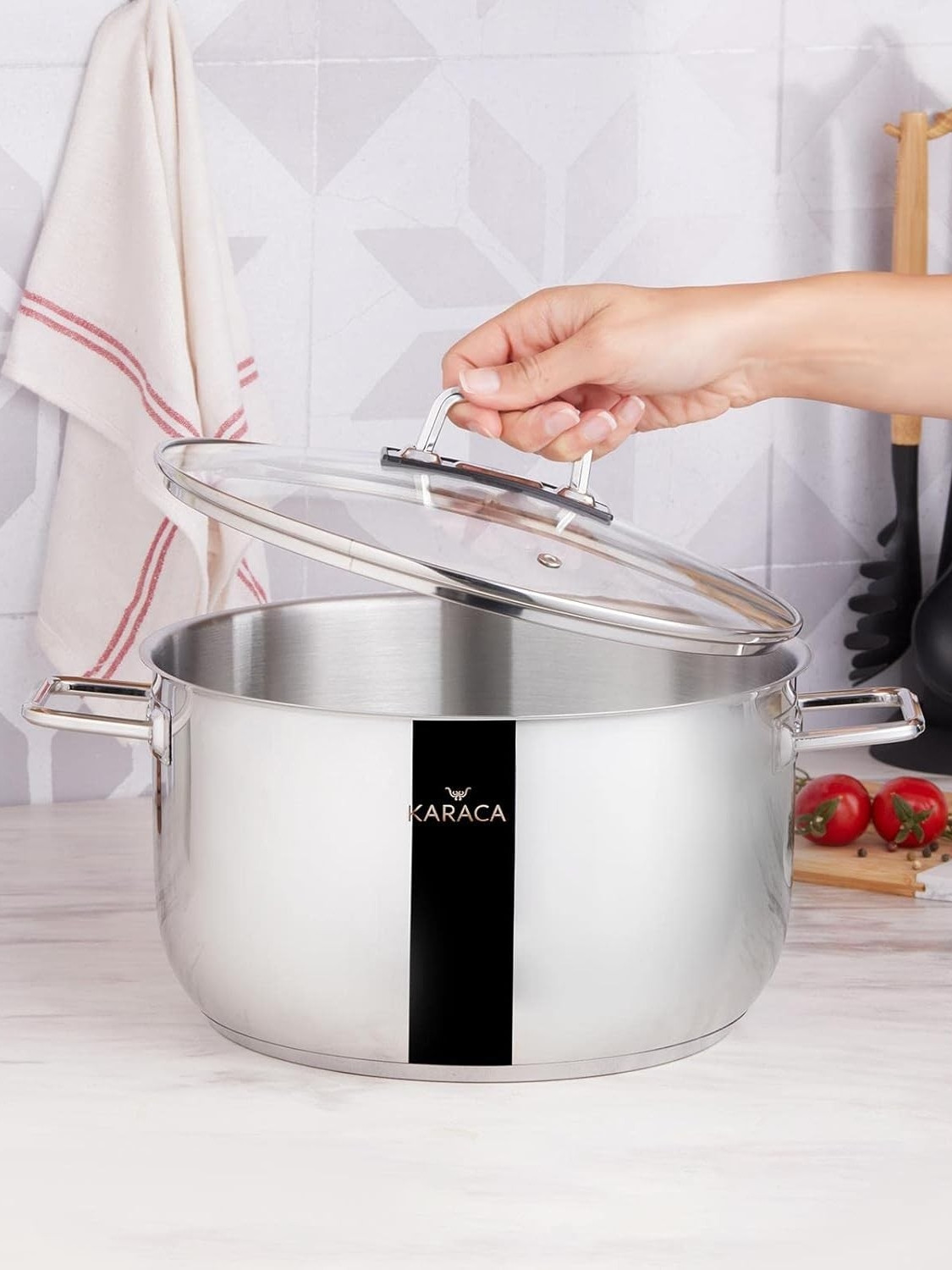 Большая и надёжная кастрюля Karaca Galaxy объёмом 15.7 литра — идеальный выбор для приготовления супов, бульонов, плова или блюд на большую семью и праздники. Выполнена из прочной нержавеющей стали с зеркальной полировкой и стильным акцентом по центру. Прозрачная крышка позволяет контролировать процесс приготовления, а удобные ручки обеспечивают безопасное использование.