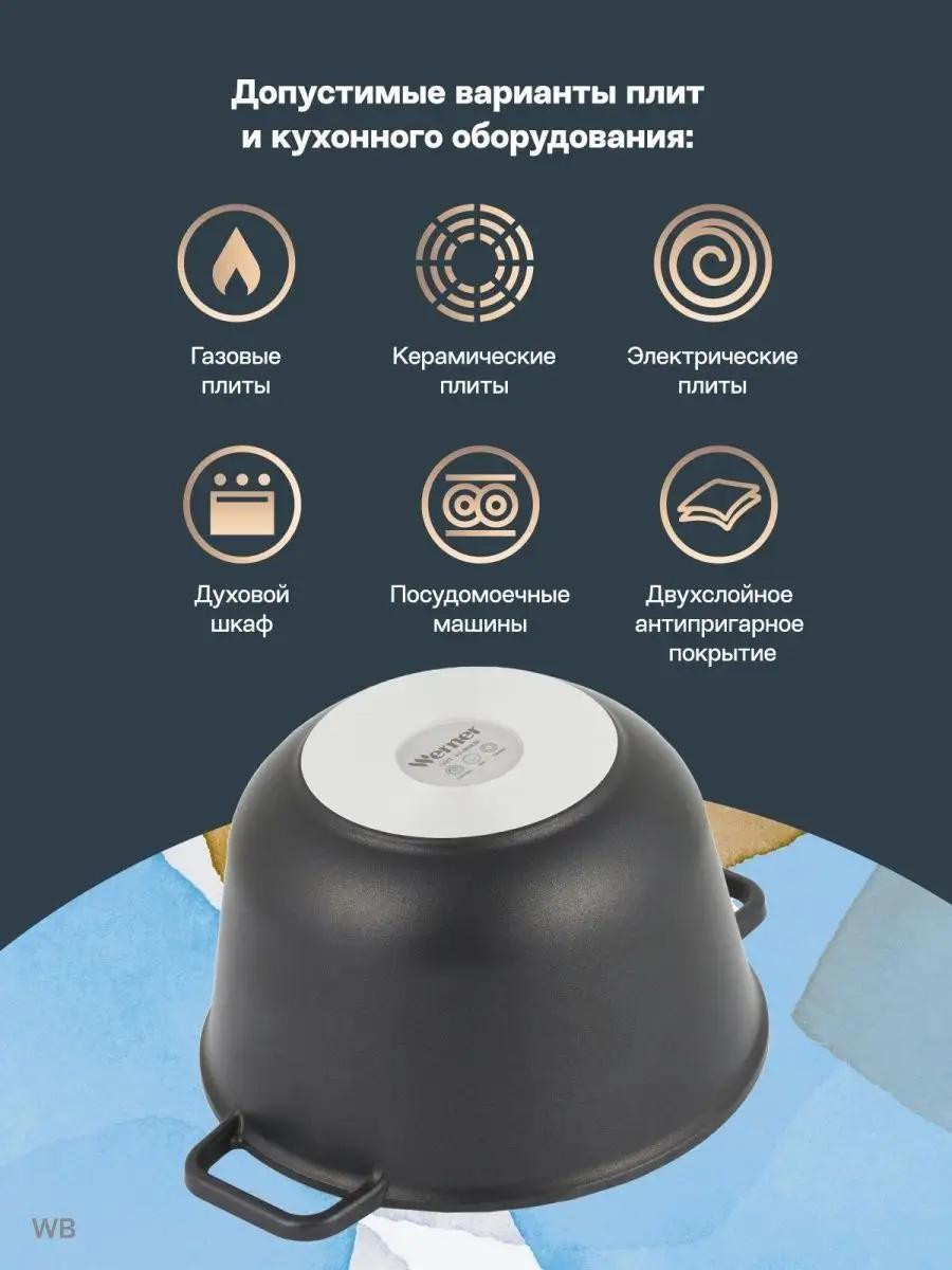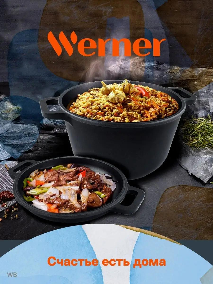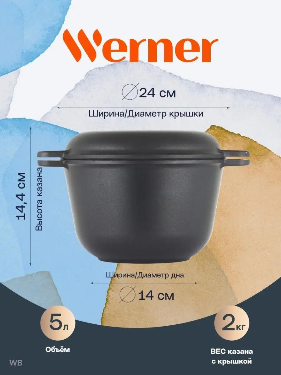 Казан Tantal 5 л с универсальной крышкой-сковородой. Толщина стенок - 4,2 мм, толщина дна - 5 мм. Диаметр изделия - 24 см, диаметр дна изделия - 14 см.В Ваших руках незаменимый помощник: казан на 5 литров с универсальной крышкой-сковородой из литого алюминия с удобными ручками. Хотите приготовить суп или запечь мясо? Собираетесь удивить гостей новыми блюдами на мангале? В этом казане любое блюдо станет удивительно сочным: суп, мясо, долма, плов или каша. Утолщенное дно надолго сохраняет тепло и равномерно распределяет его по всей поверхности. Блюда получаются сочные и ароматные. Благодаря цельнолитым ручкам используйте казан как форму для запекания в духовом шкафу. Овощи, бисквиты, куличи и запеканки – все получится идеальным. В комплекте с казаном универсальная крышка-сковорода. Двухслойное антипригарное покрытие позволит пассировать и жарить, пища не будет пригорать. Плоское дно казана легко использовать на плите, решетке мангала или в духовке. Порадуйте ваших близких и удивите гостей новыми блюдами.Вдохновляйте своими блюдами вместе с Werner. Уникальные характеристики: антипригарное покрытие с двух сторон; универсальное применение: на плите, в духовке, на решетке мангала; цельнолитые ручки (возможность использовать в духовке); универсальная крышка-сковорода; не подходит для индукционных плит; можно мыть в ПММ.