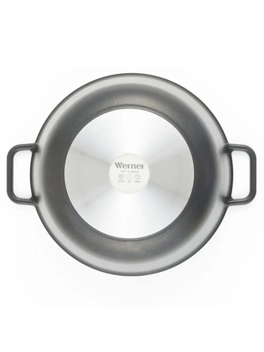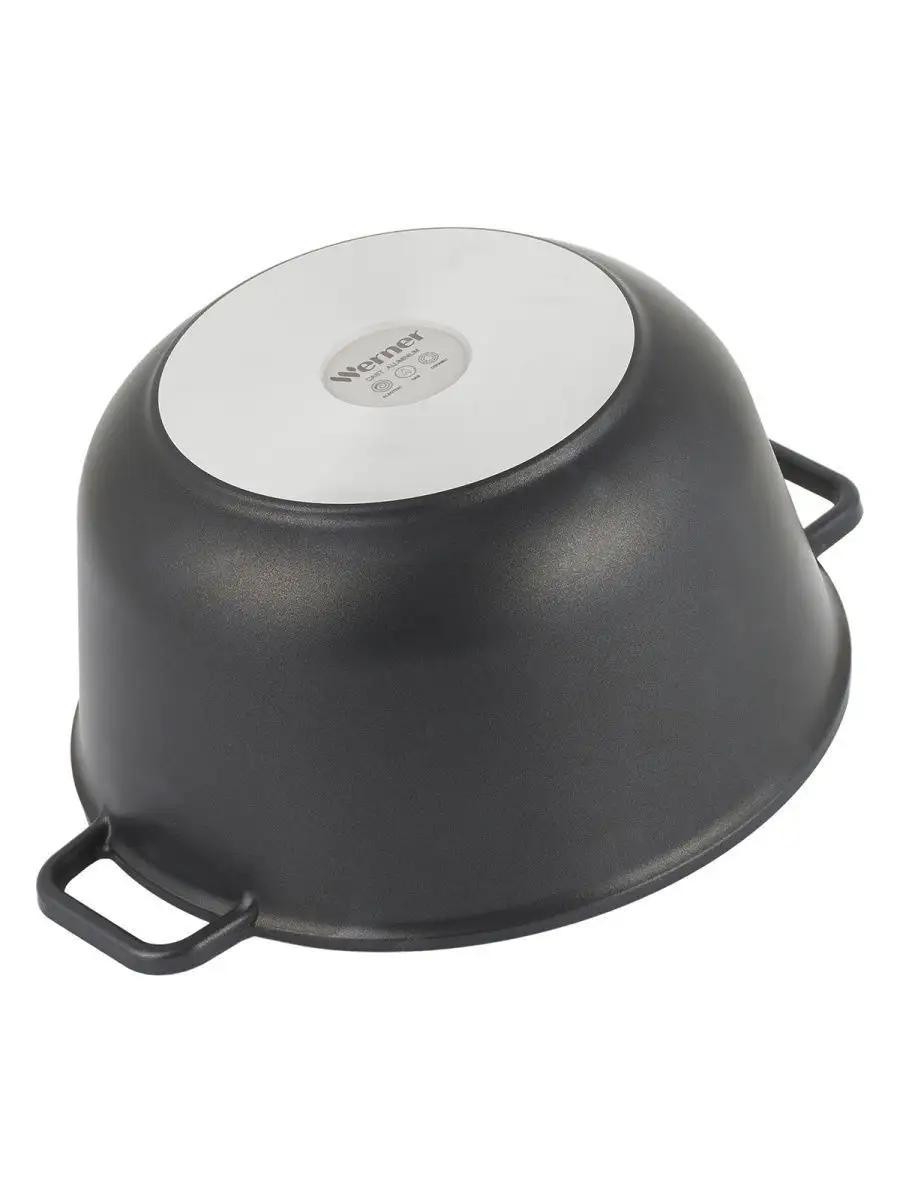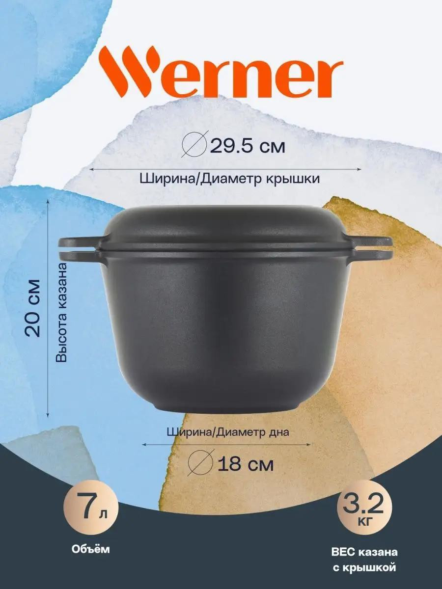Казан Werner Tantal. Объем казана 7 л. Казан с крышкой-сковородой сделан из литого алюминия. Благодаря цельнолитым ручкам казан и крышка отличаются универсальностью применения: на плите, в духовке, на решетке мангала. Внутри нанесено двухслойное антипригарное покрытие Deko. Толщина стенок 4,2 мм, толщина дна 5,5 м.