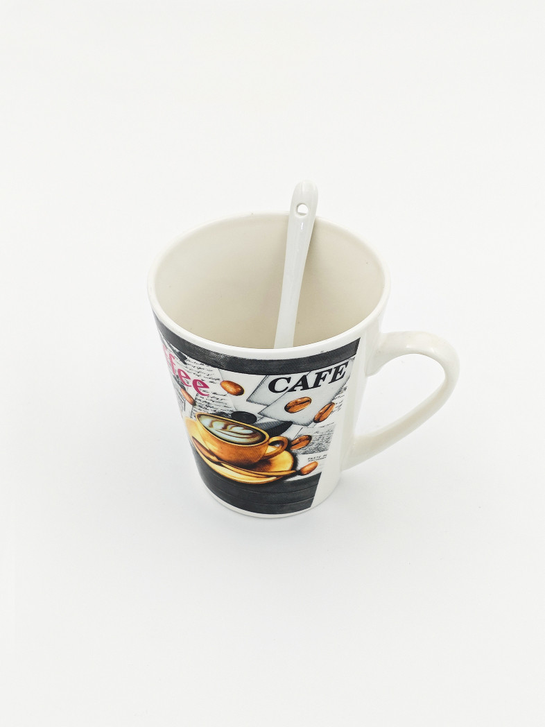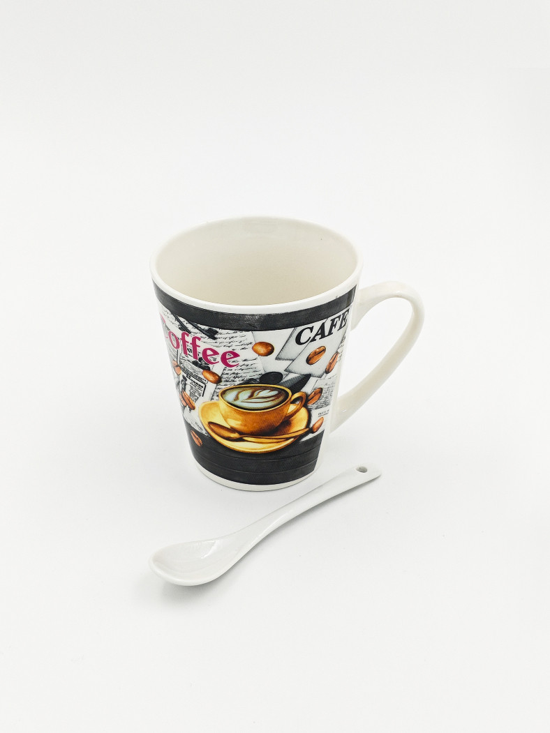 Стильная керамическая кружка с оригинальным дизайном в кофейной тематике. Изображение газетного фона, кофейных зёрен и ароматного латте создаёт уютное настроение, дополняя ритуал утреннего или вечернего кофе. В комплекте идёт удобная керамическая ложечка, которая вставляется в специальное отверстие в ручке кружки. Эргономичная форма ручки обеспечивает комфортный хват, а качественная глазурь делает поверхность гладкой и приятной на ощупь.