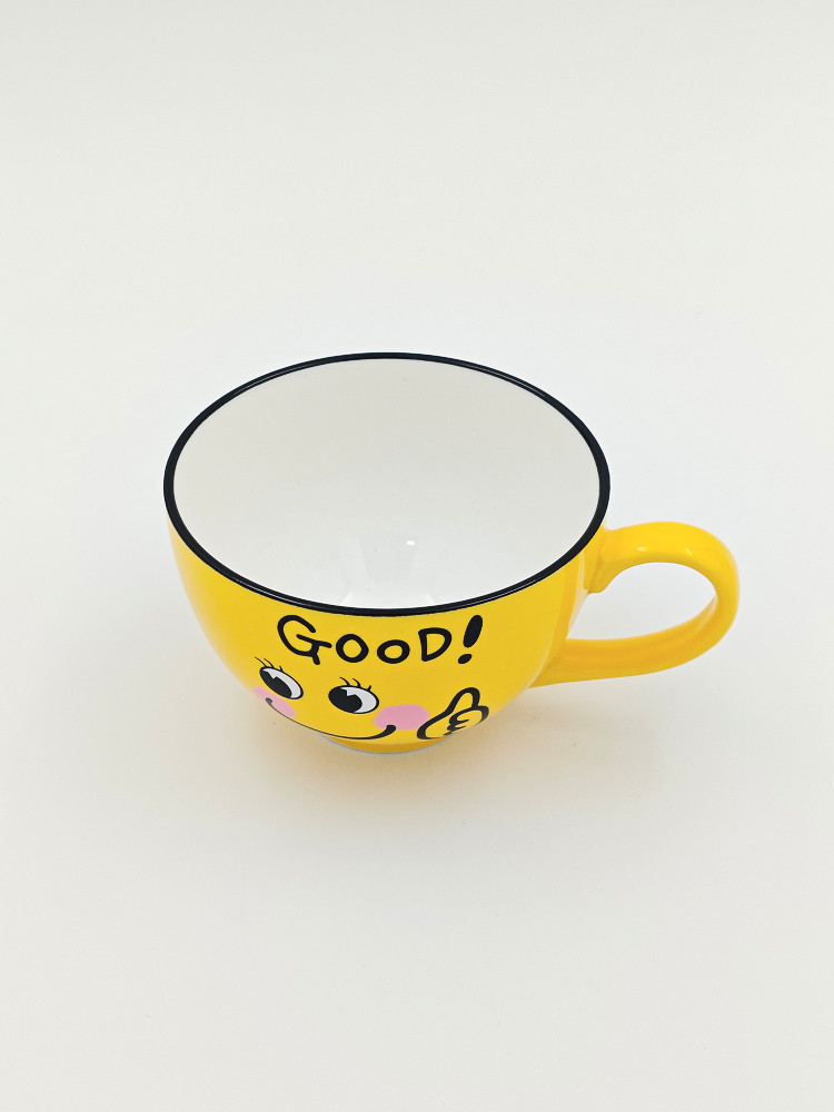 Эта яркая жёлтая кружка создана для позитивного настроения! На её поверхности изображён дружелюбный смайлик с румяными щёчками и поднятым вверх большим пальцем, а надпись "GOOD!" добавляет дополнительную мотивацию и радость.
