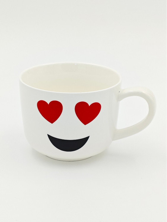 Этот очаровательный белый керамический стакан привлекает внимание своим минималистичным, но выразительным дизайном. На его внешней стороне изображено улыбающееся лицо с глазами в форме сердец – эмодзи, символизирующее любовь и восторг. Его гладкая, глянцевая поверхность придаёт ощущение качества и приятную тактильность.