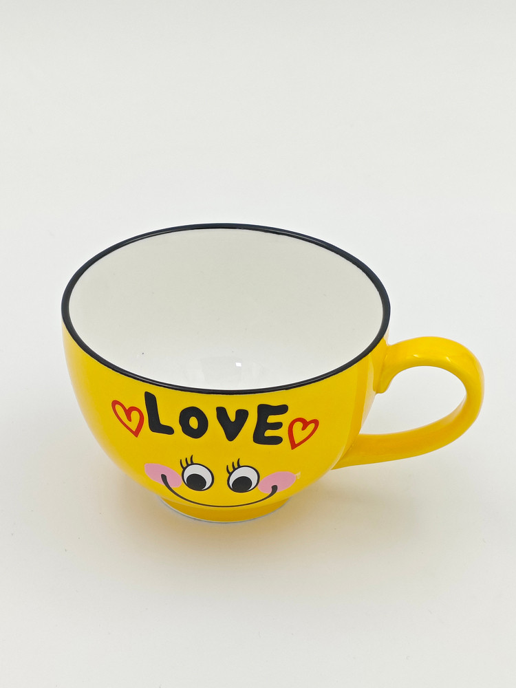 Эта очаровательная кружка создана, чтобы дарить тепло и радость! Яркий жёлтый фон, улыбчивый смайлик с румяными щёчками и надпись "LOVE" с сердечками создают атмосферу уюта и счастья.
