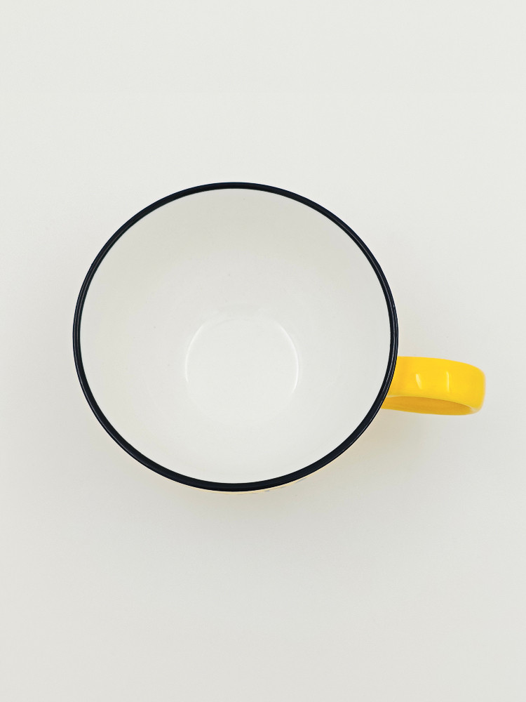Чёрная окантовка придаёт элегантность, а удобная форма делает кружку комфортной для использования. С объёмом 350–400 мл, она идеально подходит для утреннего кофе, ароматного чая или горячего шоколада.