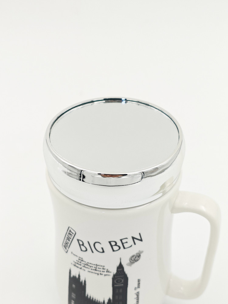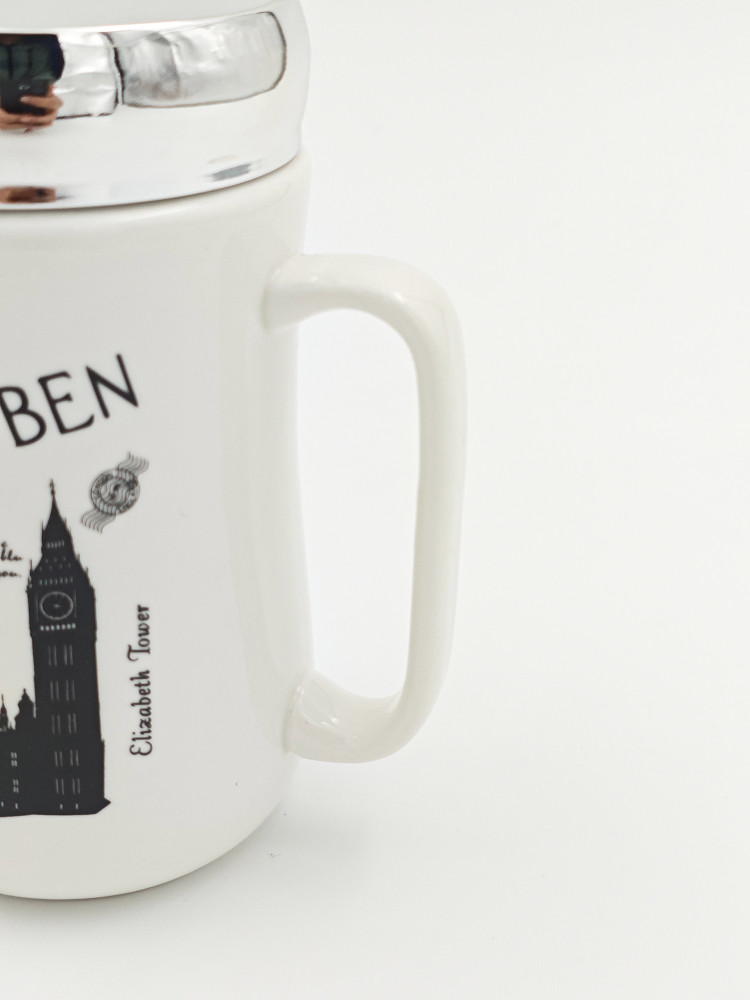 Белый цвет кружки с серебристой крышкой. На поверхности кружки нанесён черный графический принт с изображением знаменитой достопримечательности Лондона – башни Биг-Бен (Elizabeth Tower).