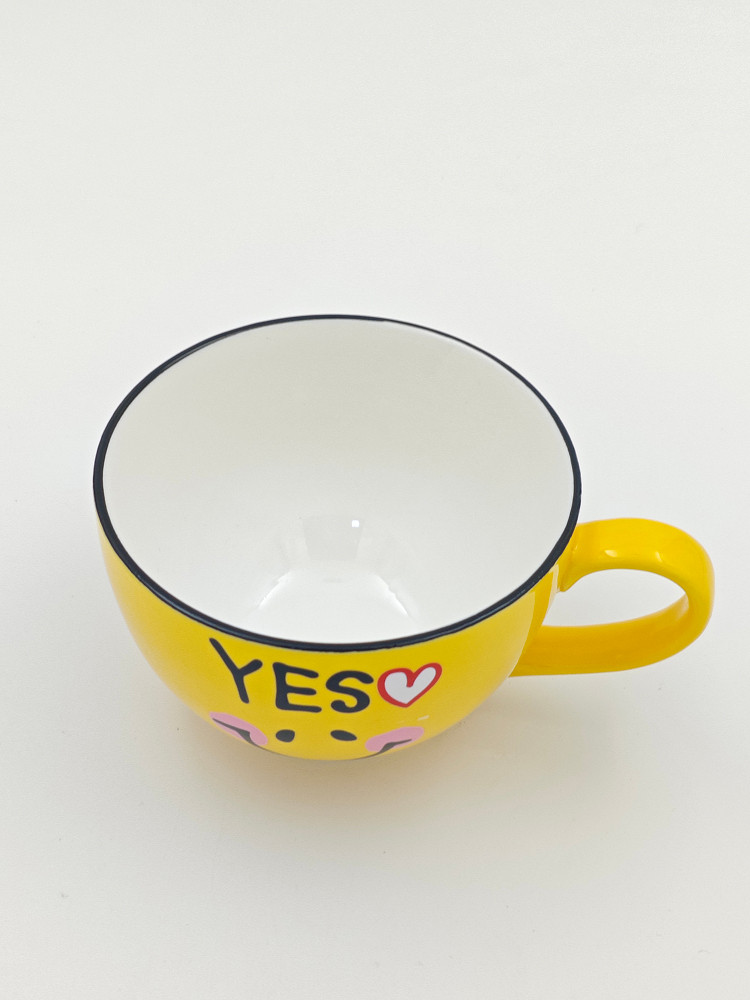 Этот яркий жёлтый керамический стакан заряжает позитивом с первого взгляда! Его дизайн украшен милым улыбающимся смайликом и надписью "YES❤️", что создаёт ощущение радости и оптимизма. Контрастный чёрный ободок добавляет стильный акцент, а широкая форма делает кружку удобной для горячих напитков.