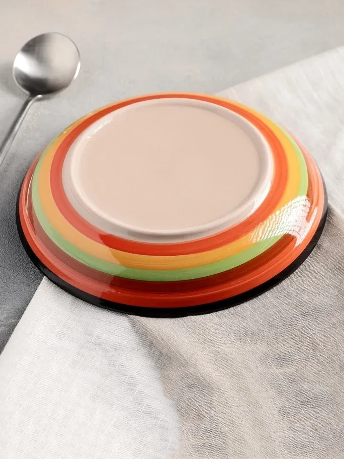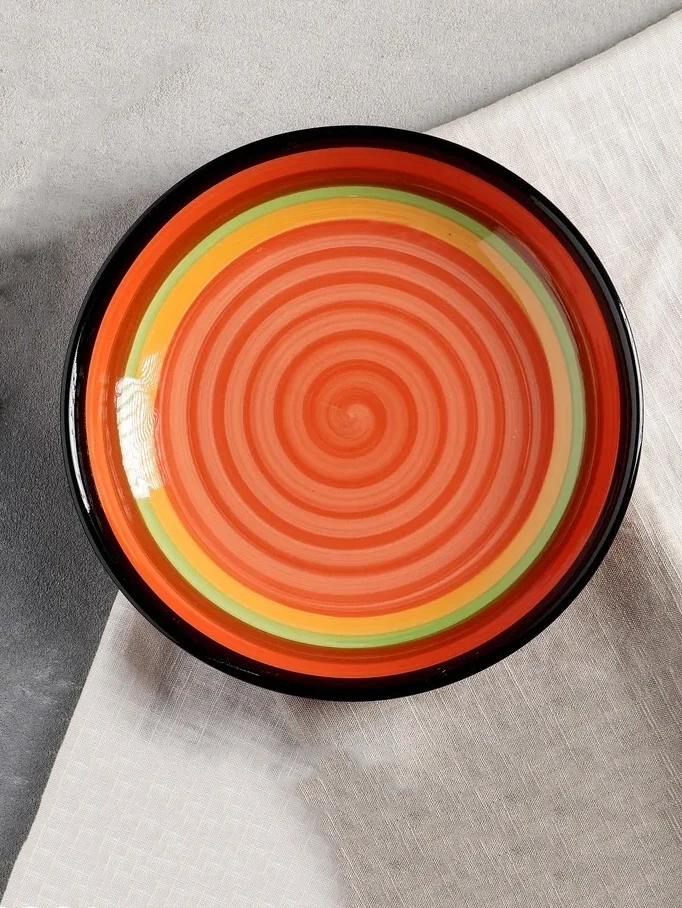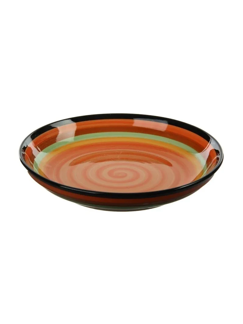 Керамическая тарелка Skyphos Premium – это гармоничное сочетание яркого дизайна и функциональности. Глубокие, насыщенные оттенки оранжевого, зелёного и жёлтого, переходящие в эффектную спираль, создают атмосферу уюта и тепла. Чёрная окантовка придаёт элегантности и завершённости.