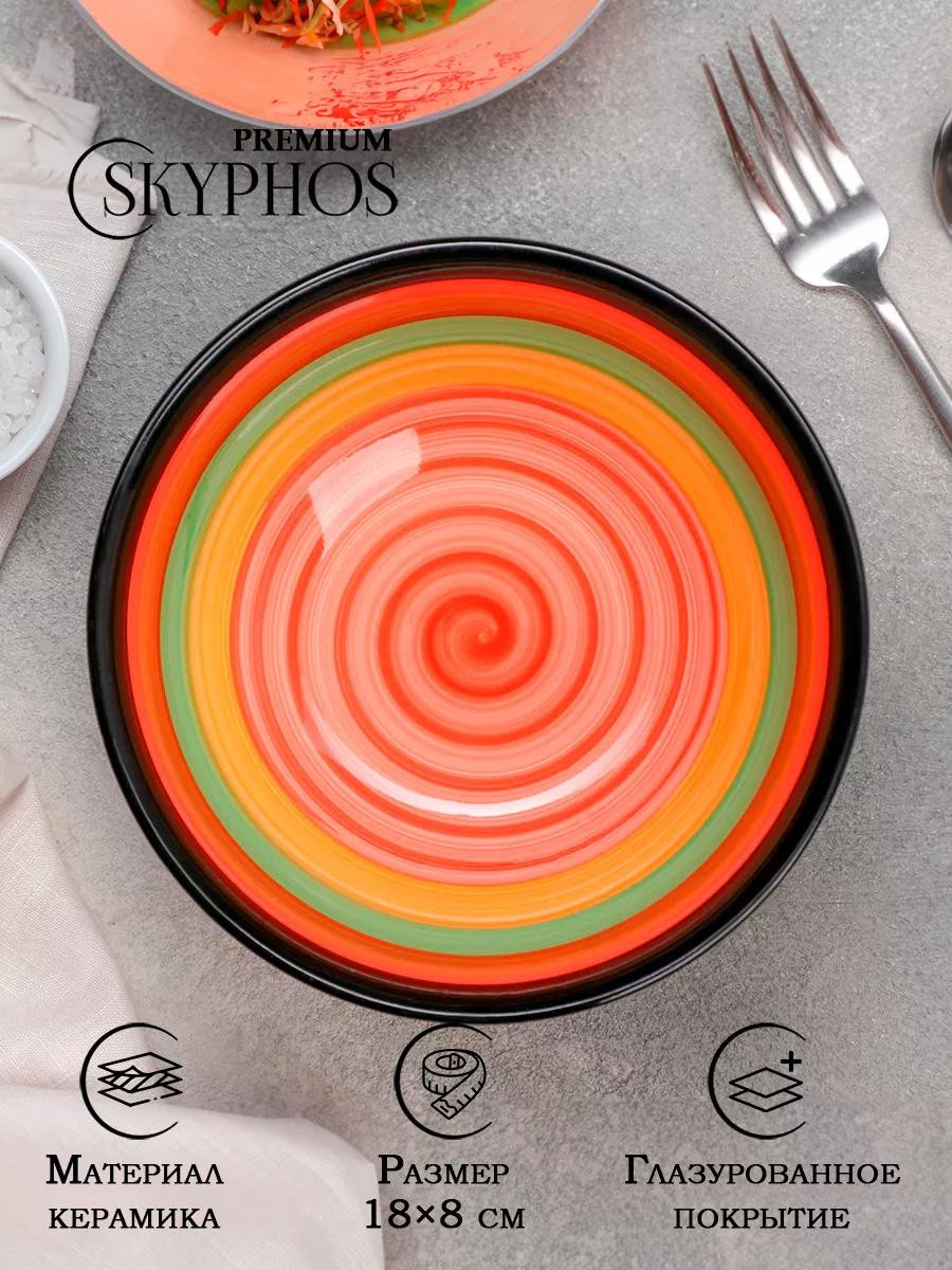 Керамическая миска Skyphos Premium – это стильный и функциональный элемент сервировки, который украсит любой стол. Яркие оранжевые, зелёные и жёлтые оттенки, плавно перетекающие в спиральный узор, создают эффект уюта и тепла. Глянцевая глазурь придаёт блеск и делает поверхность гладкой, а контрастная чёрная окантовка подчёркивает её элегантность.