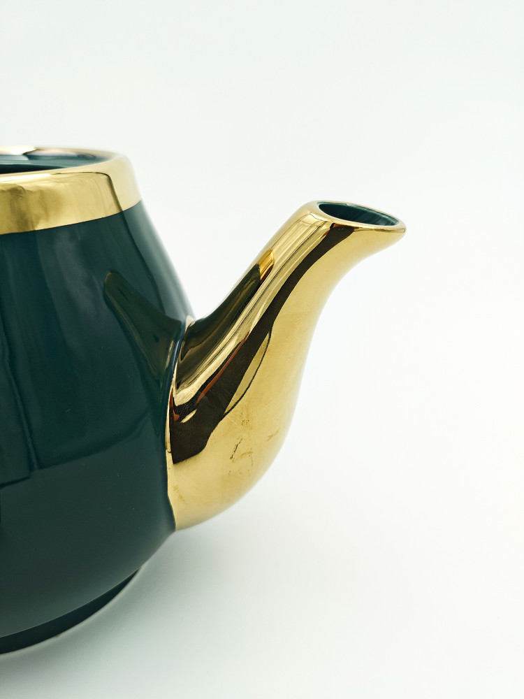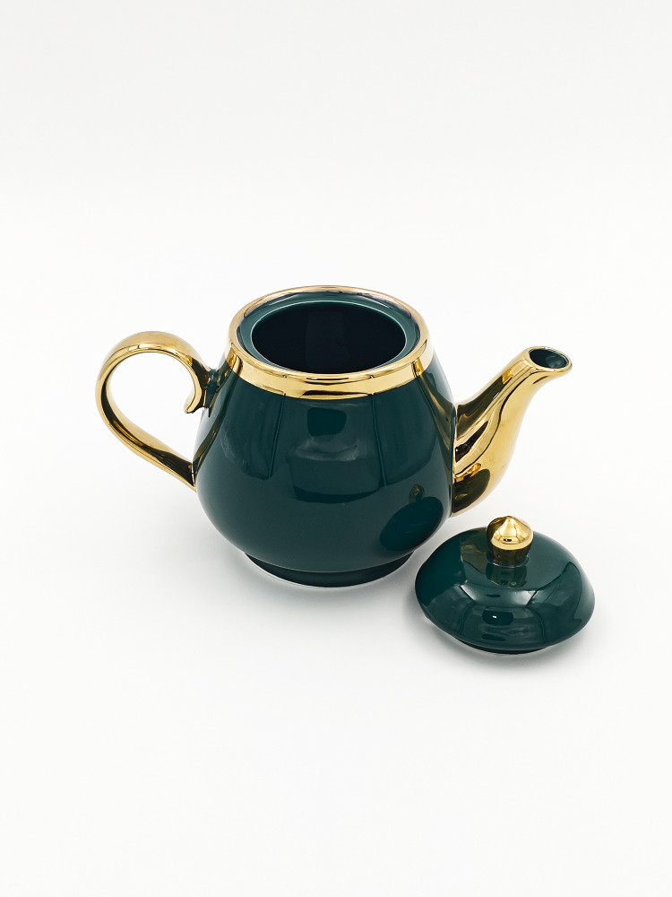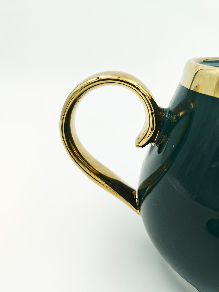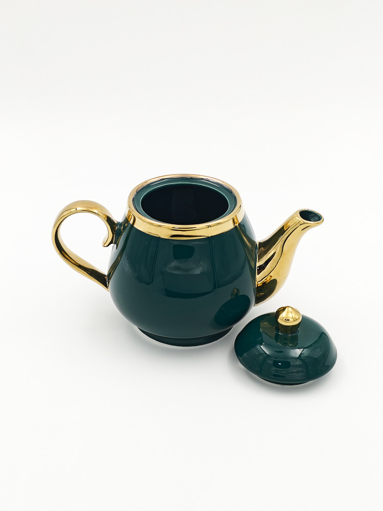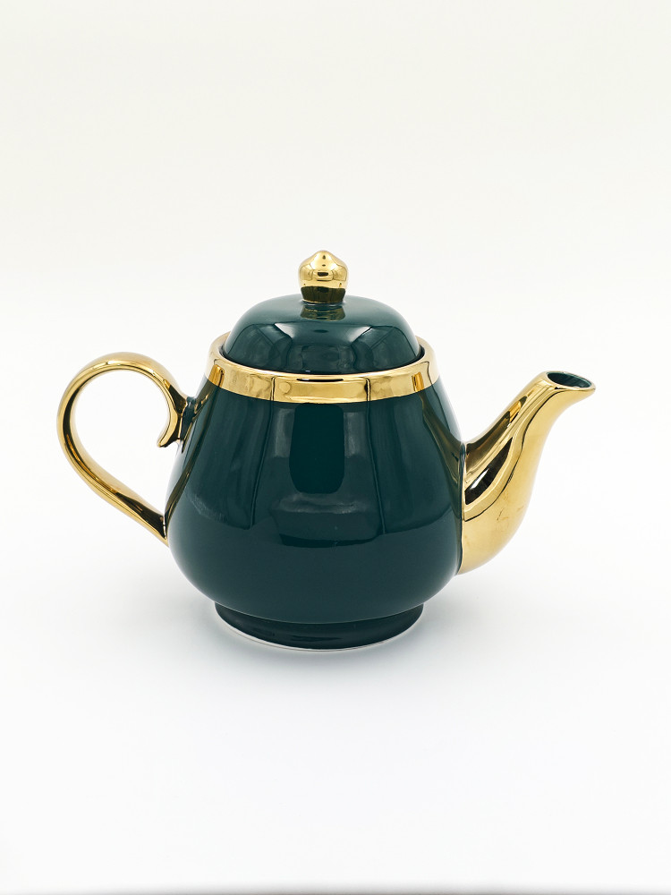 Роскошный заварочный чайник глубокого изумрудного цвета с элегантными золотыми элементами. Изготовлен из качественной керамики с глянцевым покрытием, он добавит утонченность любому чаепитию. Удобная ручка и классический носик обеспечивают комфортное наливание без проливов. Идеальный выбор для настоящих ценителей чая и стильный акцент в любом интерьере.
