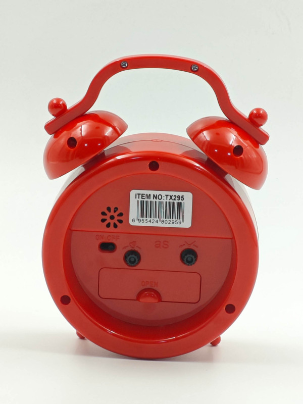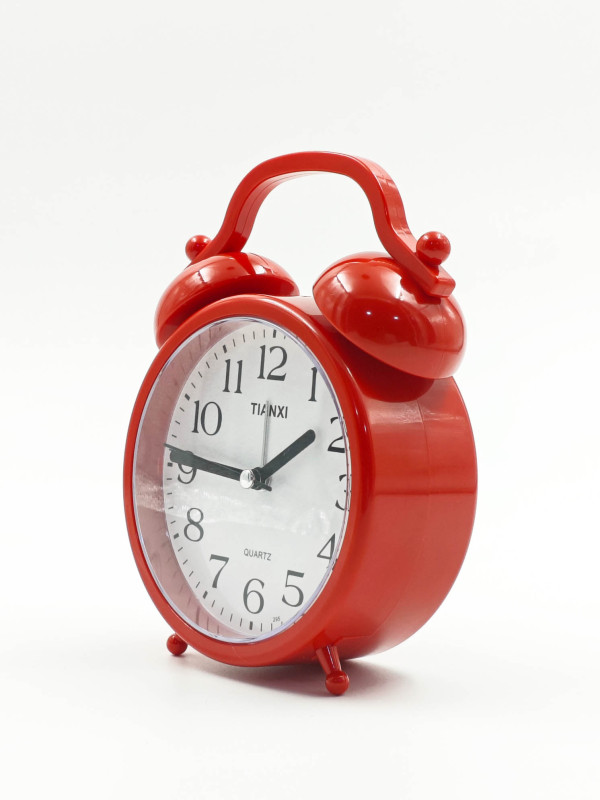 Это классический механический будильник в ретро-стиле с двумя звонками, выполненный в ярко-красном цвете. Он имеет круглую металлическую конструкцию с прочной ручкой сверху. Будильник оснащен четким циферблатом с арабскими цифрами и кварцевым механизмом, обеспечивающим точное время.