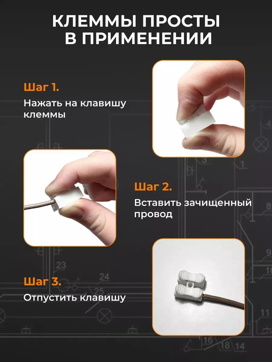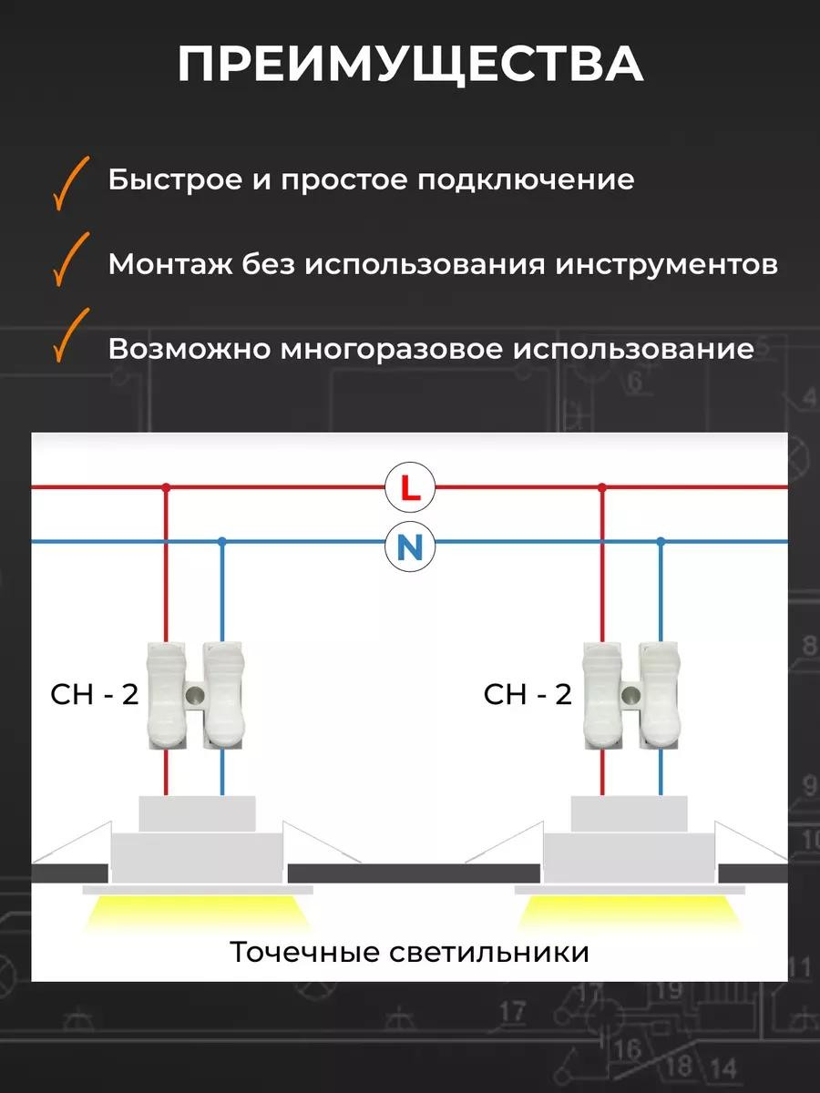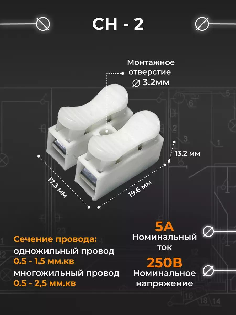 Пружинный быстроразъемный соединитель. Клеммы для проводов нажимные предназначены для соединения одножильных и многожильных проводов при монтаже светильников, особенно встроенных, а также любого другого электрического оборудования. Клеммники для проводов CH-2 просты в применении. Для монтажа не нужны дополнительные инструменты: достаточно нажать на клавишу клеммы, вставить подготовленный провод и отпустить клавишу. Наличие монтажного отверстия позволяет зафиксировать клемму по месту монтажа.