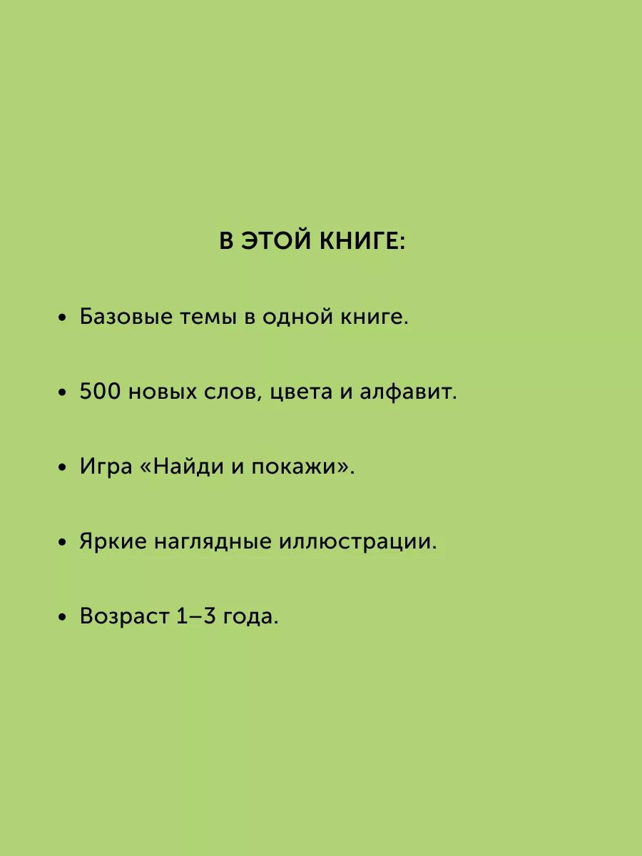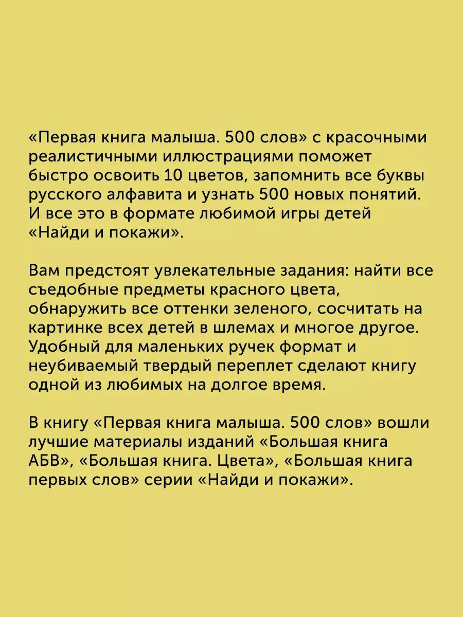 В книгу «Первая книга малыша. 500 слов» вошли лучшие материалы изданий «Большая книга АБВ», «Большая книга. Цвета», «Большая книга первых слов» серии «Найди и покажи».
