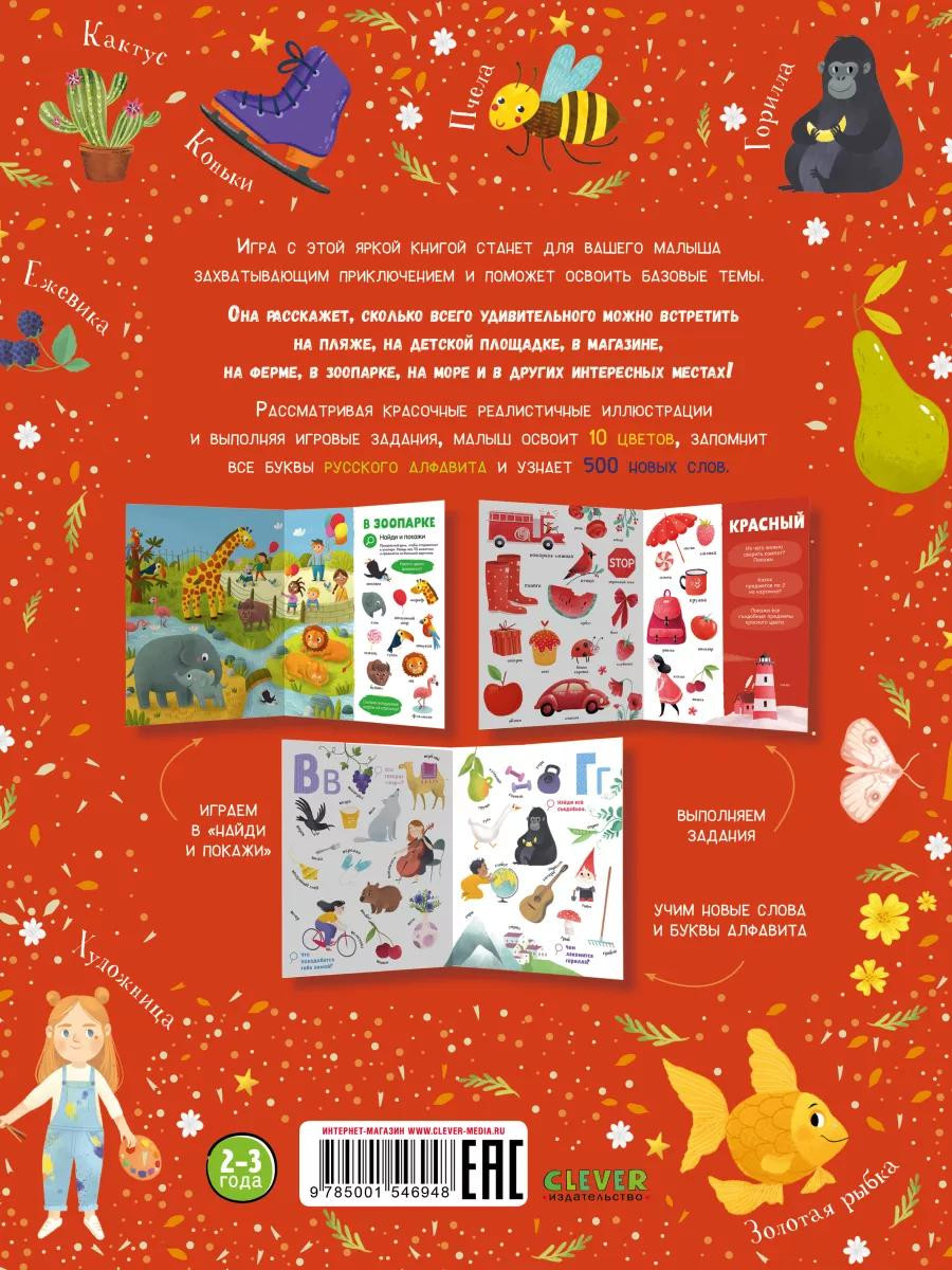 «Первая книга малыша. 500 слов» с красочными реалистичными иллюстрациями поможет быстро освоить 10 цветов, запомнить все буквы русского алфавита и узнать 500 новых понятий. И все это в формате любимой игры детей «Найди и покажи».