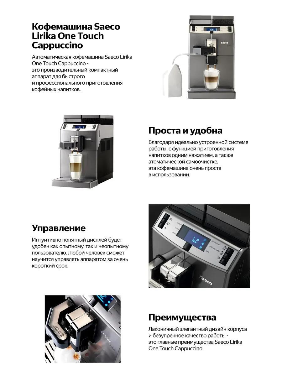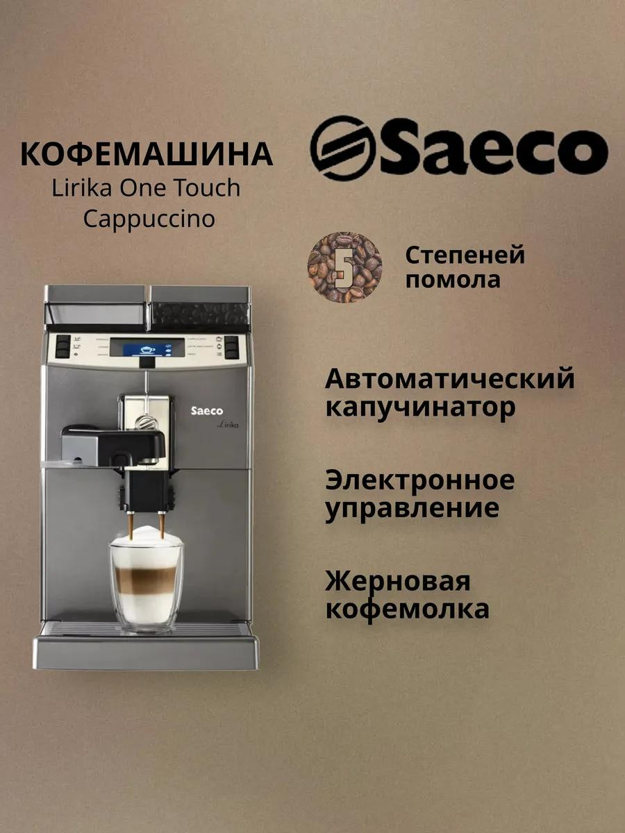 Saeco Lirika One Touch Cappuccino – простая , компактная и высокопроизводительная кофемашина, которая готовит идеальный эспрессо и капучино из свежих зерен благодаря керамическим жерновам. Прекрасно подходит для офисов и небольших HoReCa – предприятий. Обладает современным и практичным дизайном, оснащена вместительными ёмкостями для воды и кофе и невероятно проста в обращении. Программируйте крепость, температуру и объем напитка на интуитивно понятном дисплее. Капучинатор «One Touch Cappuccino» (капучино одним касание) – горячий капучино готовится одним нажатием кнопки благодаря встроенному капучинатору для молока. Эксклюзиваная система Saeco для приготовления превосходного капучино или латте с помощью автокапучинатора. Функция очистки «Mini-Clean»: после каждой подачи молока система предлагает запустить процедуру самоочистки, используя примерно 20 мл воды.