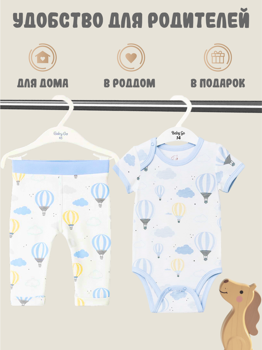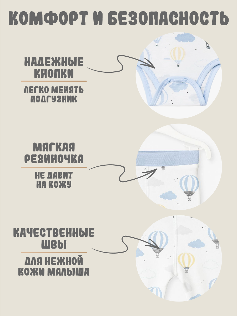 Приятный принт с воздушными шарами и облаками добавляет образу лёгкости и уюта. Боди удобно застёгивается на кнопки снизу, штанишки оснащены мягким эластичным поясом.