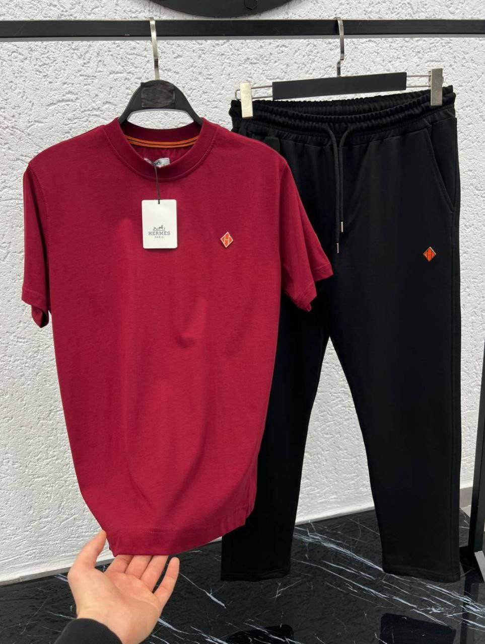 Стильный комплект, включающий белую или бордовую футболку с круглым вырезом и спортивные штаны. Футболка украшена маленькой нашивкой с логотипом на груди, выполнена из мягкого и приятного на ощупь материала. Штаны имеют удобную посадку, резинку на талии и также украшены фирменной нашивкой.