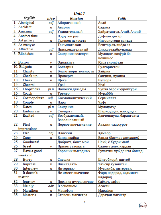 Vocabulary (Луғат) – Словарь с переводом на таджикский и русский языки, включающий основные слова и выражения уровня Pre-Intermediate. Удобен для быстрого поиска и запоминания новых слов.