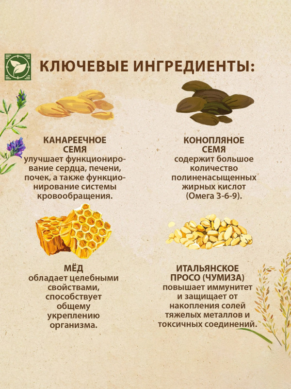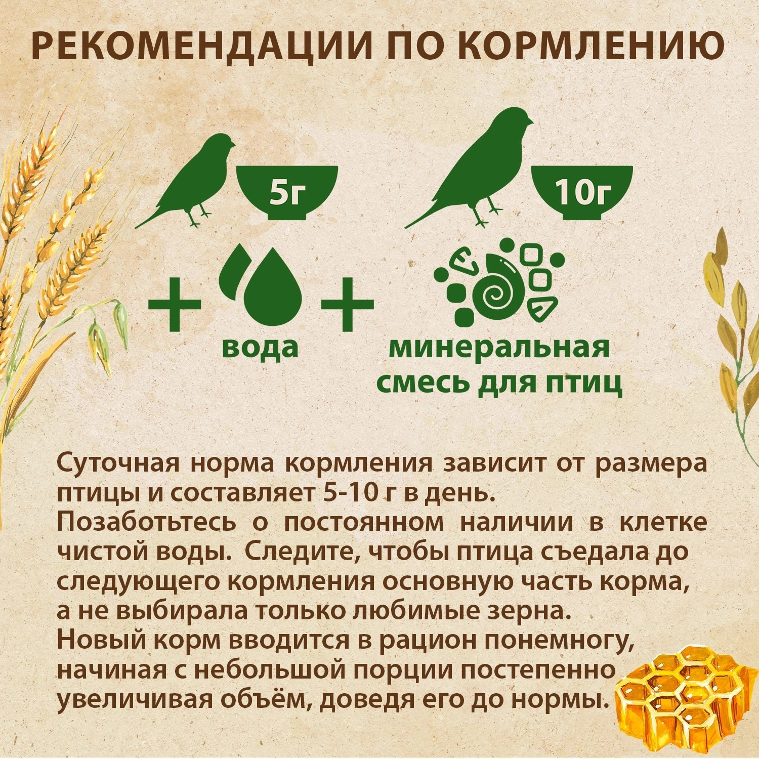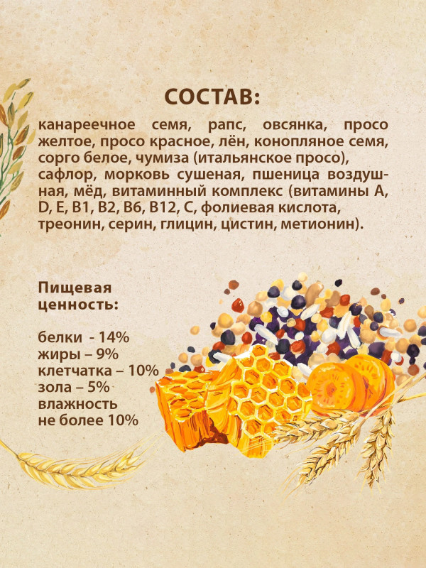 | Ингредиенты | канареечное семя, рапс, овсянка, просо жёлтое, просо красное, лён, конопляное семя, сорго белое, чумиза (итальянское просо), сафлор, морковь сушеная, пшеница воздушная, мёд, витаминный комплекс (витамины A,D,E,B1,B2,B6,B12,C, фолиевая кислота, треонин, серин, глицин, цистин, метионин) |
