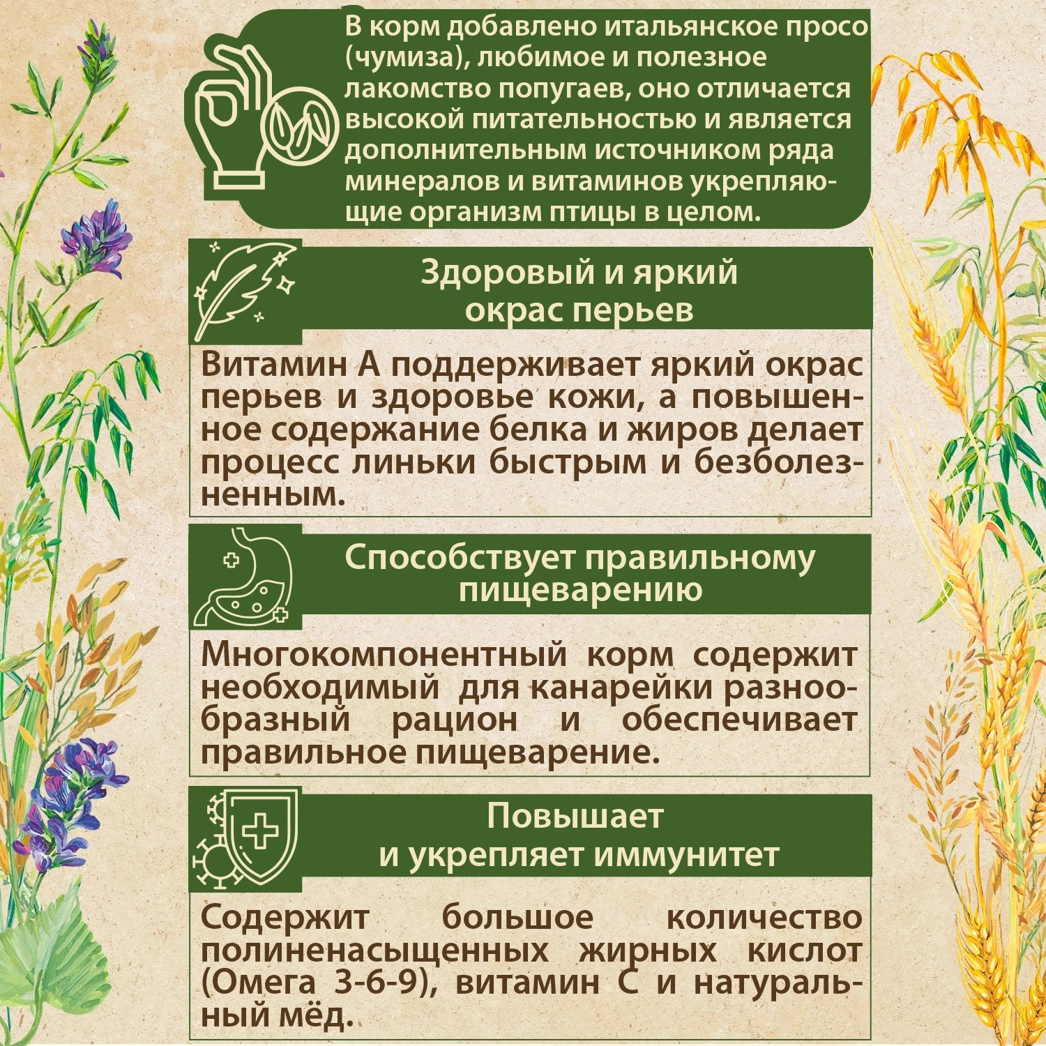 это сбалансированный корм, разработанный в соответствии с пищевыми потребностями канареек. Корм содержит весь комплекс необходимых питательных веществ, витаминов, минералов и аминокислот, способных поддержать хорошее самочувствие и активность вашей канарейки.
