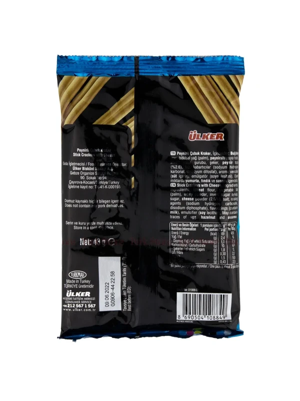 Хрустящие палочки-кракеры с насыщенным сырным вкусом. Лёгкий солёный перекус в удобной упаковке, идеально подходит для дороги, учёбы или работы. Производятся в Турции по классическим рецептам компании Ülker.