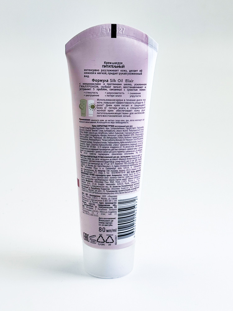 Крем для рук «Бархатные ручки» Питательный с формулой Silk Oil Elixir обеспечивает ежедневный уход и защиту кожи от 5 проблем сухости. В составе — масло ши, протеины шёлка, провитамин B5 и гиалурон. Интенсивно питает, смягчает и придаёт рукам ухоженный вид. Подходит для всех типов кожи.