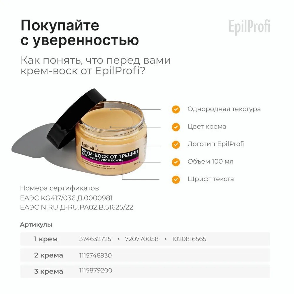 Крем № 1 от трещин и шелушенийКрем-воск от трещин EpilProfi предназначен для ухода за очень сухой кожей