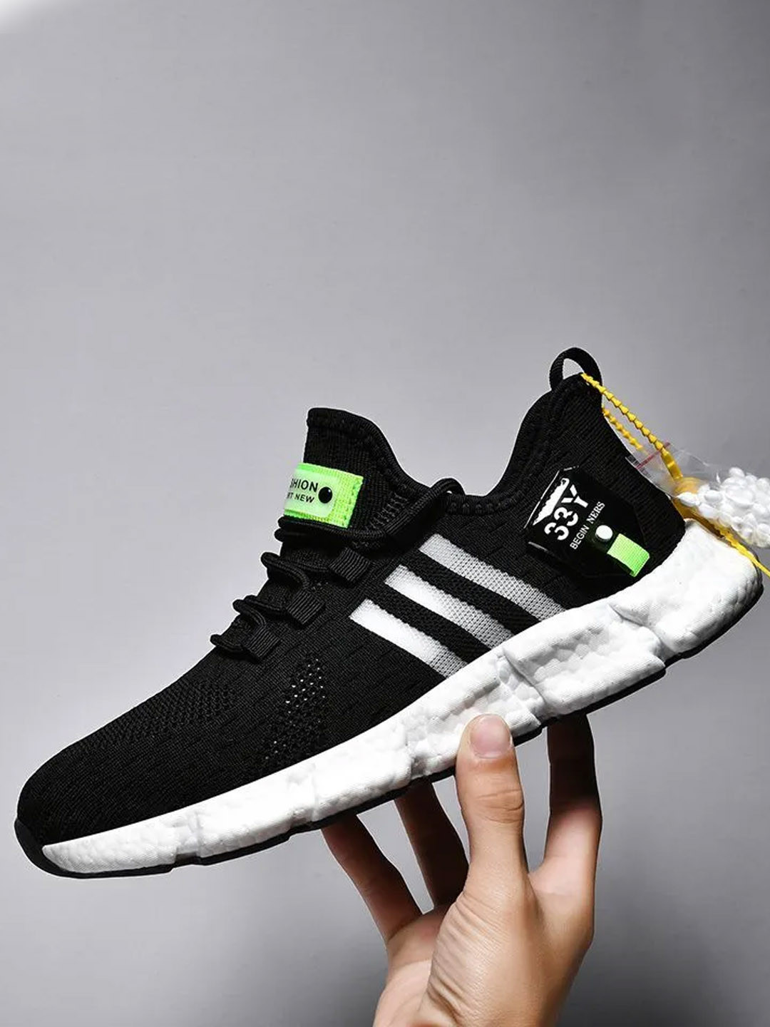 Стильные спортивные кроссовки в классическом черном цвете с контрастными белыми полосками и неоновыми акцентами. Модель выполнена из дышащего трикотажного материала, обеспечивающего комфорт в течение дня. Удобная подошва с амортизирующим эффектом и пружинистая шнуровка делают эту пару идеальной для активного образа жизни, прогулок или повседневной носки.