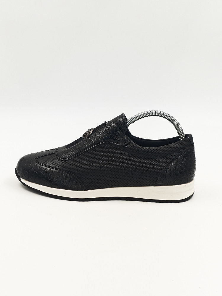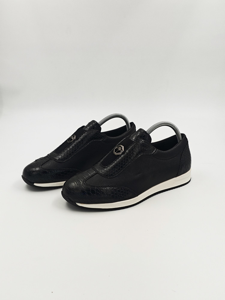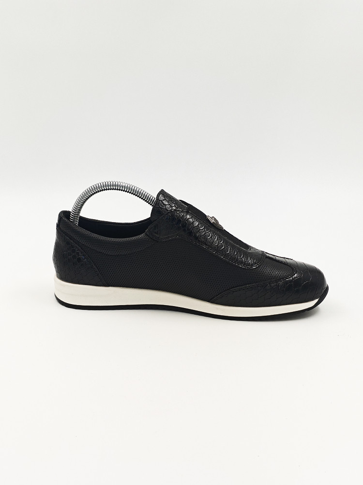 Эти мужские кроссовки с черным кожаным верхом и текстурой под змеиную кожу — стильный выбор для повседневной носки. Элегантная спортивная обувь оснащена удобной подошвой, идеально подходящей как для активных прогулок, так и для повседневной носки. Металлический логотип на внешней части обуви добавляет стильный акцент.