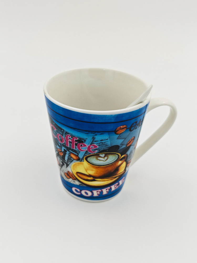 Стильная фарфоровая кружка для настоящих ценителей кофе. Яркий дизайн с синим фоном украшен изображением ароматного кофе в золотистой чашке, кофейных зерен и надписи «Coffee», создавая атмосферу уютного кафе.