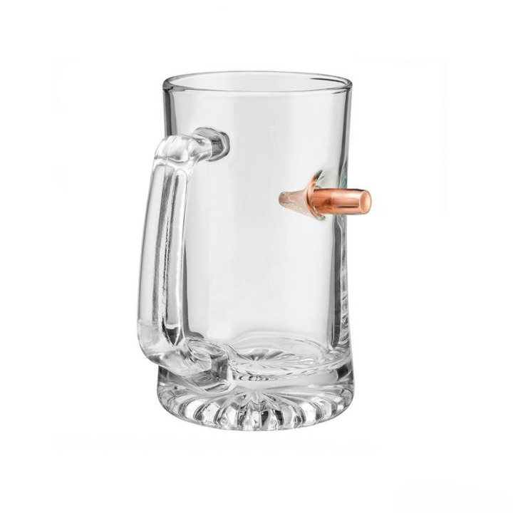 На изображении представлена необычная стеклянная кружка с оригинальным дизайном: в стенке кружки встроена пуля. Пуля выглядит так, словно она пробила стекло и застряла внутри, создавая эффект замерзшего момента. Этот аксессуар вызывает ассоциации с динамичностью и стилем, а также может стать отличным подарком для любителей оригинальных и креативных предметов декора.