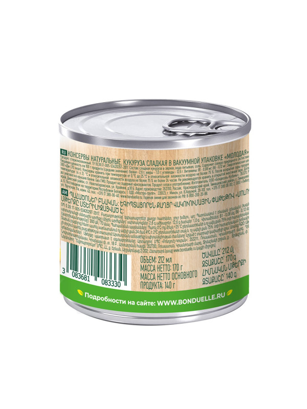 Вакуумная упаковка сохраняет свежесть и нежную текстуру сладкой молодой кукурузы. Зерна сочные, мягкие, с натуральным сладковатым вкусом. Продукт готов к употреблению — идеально подходит в качестве гарнира, а также для приготовления салатов, закусок, супов, мексиканской и азиатской кухни.