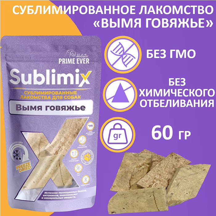 Prime Ever Sublimix (Сублимикс) Вымя говяжье 60г. Prime Ever Sublimix — это инновационные сублимированные лакомства для собак всех пород с 3х месяцев. Вымя нарезано на маленькие кусочки, что делает это лакомство идеальным выбором для использования при дрессировке. Более мягкая структура лакомства, в сравнении с традиционными сушеными лакомствами, позволяет давать его в том числе щенкам, без риска повреждения зубов и десен. При изготовлении применяется современная технология сублимации, которая позволяет сохранить от 94% всех полезных веществ, микроэлементов и витаминов исходного сырья, при этом оставляя неизменными натуральными аромат и вкус продукта. Особенности лакомств Sublimix: ✔ Способствуют бережному очищению зубов от налета ✔ Лакомства изготавливаются из натурального мяса и субпродуктов ✔ Не содержат ГМО ✔ Благоприятно воздействуют на пищеварительную систему животного. Нормы кормления: Лакомства не должны составлять более 10% ежедневного рациона собаки. Также обеспечьте питомцу постоянный доступ к чистой воде.