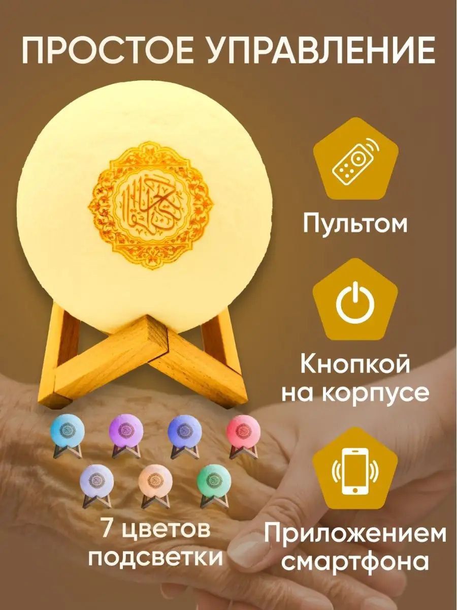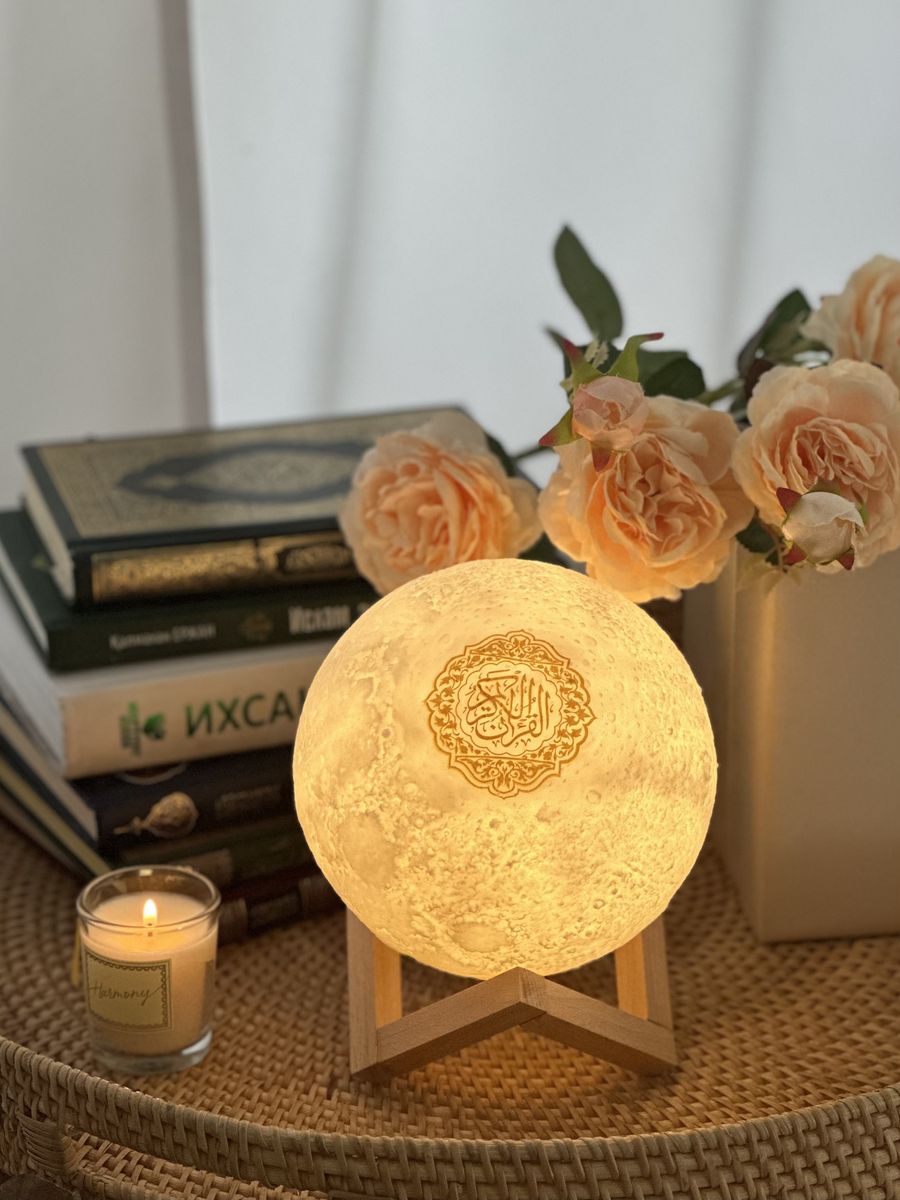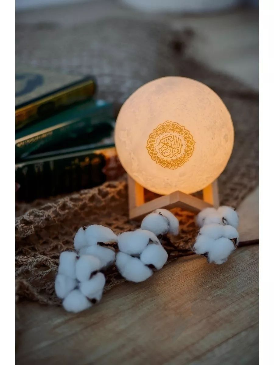 Светильник луна читающий Коран с переводом на 16 языков, в том числе русский, отличный способ наполнить дом теплом, уютом и святым звучанием Корана. Коран ночник читается 16 известными Арабскими чтецами. ПЕРЕВОДЫ: Русский,Фарси(Таджикский),Татарский язык, Узбекский, Турецкий, Английский и др. Управляется Лампа пультом или приложением Quran Speaker в смартфоне. Лампа также проигрывает: Тафсир Корана, Нашиды(мелодии), Сборники Хадисов Бухари и Муслима, Рукъя (Молитвы от сглаза, колдовства, болезней, порчи), Азан Молитвы из намаза, Молитвы Крепость верующего, Арабская Алифба. Комбинированный режим читает Арабский и сразу переводит. Работает как Bluetooth колонка. Зарядка 50мин (моргает зеленым - заряжается, перестал - зарядился) (используя адаптер 5В/2А, в комлпекте только кабель) Ночник читающий Коран отлично подойдет в изучении молитвы намаз, подарок Рамадан, праздник Ураза Байран, Курбан Байрам, Исламские праздники, Мусульманские подарки, Рамадан подарки. Детский ночник, отлично подойдет как подарок для детей. Освещение луной создаст теплую вечернюю обстановку в каждой комнате. А форма светильника луна точно будет интересна как взрослым, так и детям. Лампа космос на подставке. Луна светильник миниатюрного размера, но очень мощная – будет освещать собой всю комнату. Также используется как подсветка для комнаты – у нее 7 разных цветов подсветки. Светильник идет с пультом и кнопкой на корпусе. Ночник коран может длительно время работать на одном заряде – до 10 часов. У корана светильника в комплекте также идет зарядный провод. Светильник космос проектор отличный подарок для детей, мужчин, женщин на день рождения или любой другой праздник. Коран на арабском – мусульманский светильник, такой светильник луна точно понравится каждому, кто верует в ислам.
