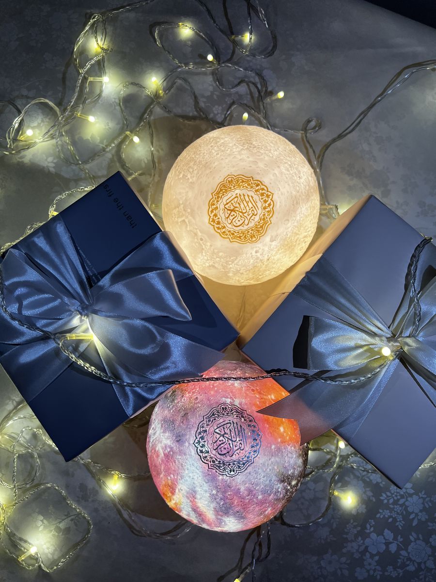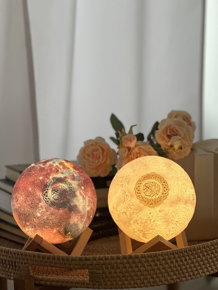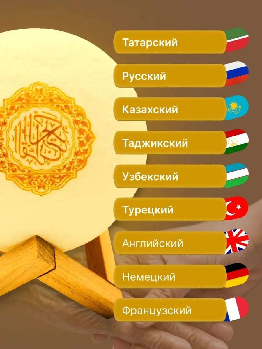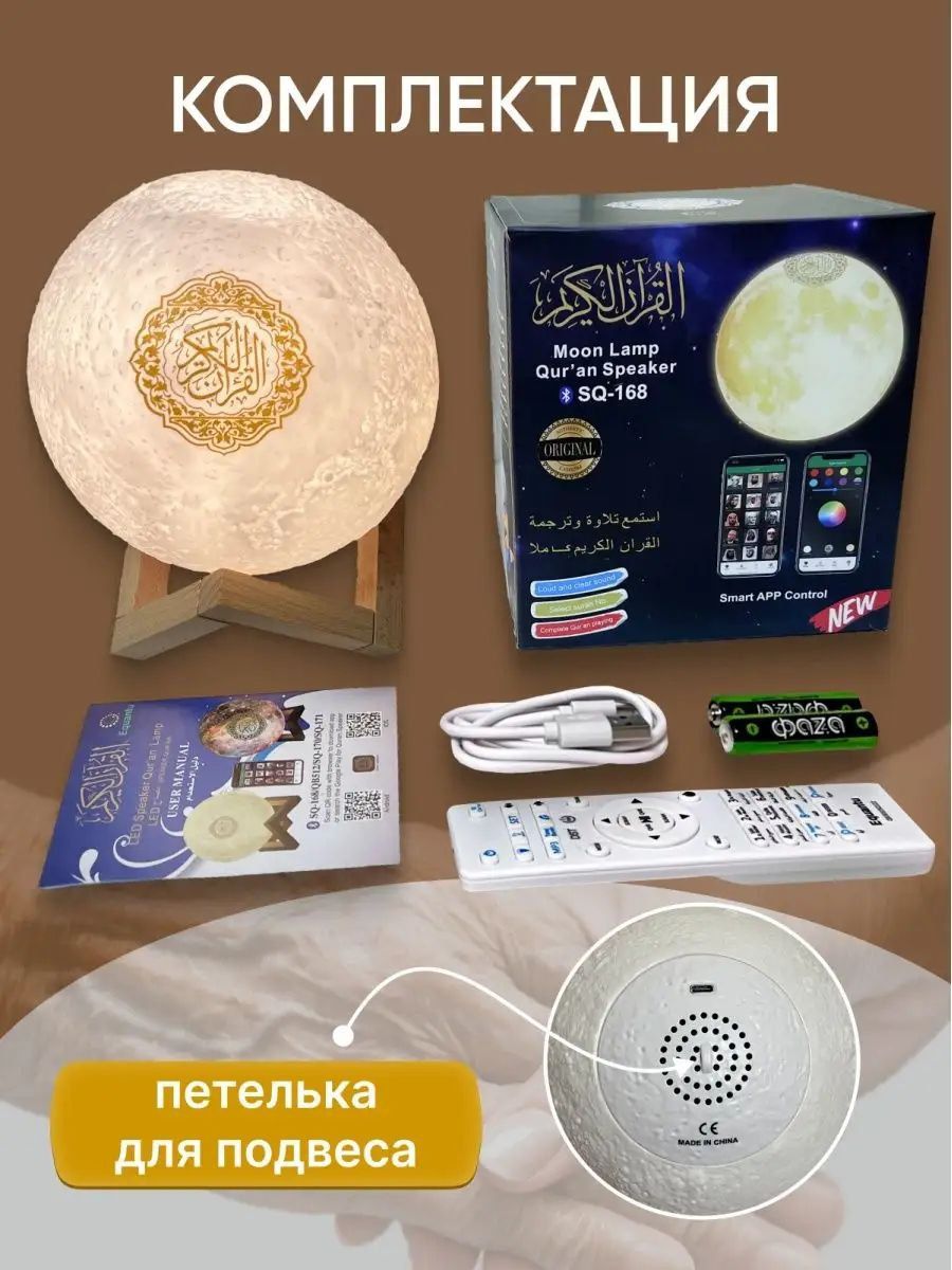 Светильник луна читающий Коран с переводом на 16 языков, в том числе русский, отличный способ наполнить дом теплом, уютом и святым звучанием Корана. Коран ночник читается 16 известными Арабскими чтецами. ПЕРЕВОДЫ: Русский,Фарси(Таджикский),Татарский язык, Узбекский, Турецкий, Английский и др. Управляется Лампа пультом или приложением Quran Speaker в смартфоне. Лампа также проигрывает: Тафсир Корана, Нашиды(мелодии), Сборники Хадисов Бухари и Муслима, Рукъя (Молитвы от сглаза, колдовства, болезней, порчи), Азан Молитвы из намаза, Молитвы Крепость верующего, Арабская Алифба. Комбинированный режим читает Арабский и сразу переводит. Работает как Bluetooth колонка. Зарядка 50мин (моргает зеленым - заряжается, перестал - зарядился) (используя адаптер 5В/2А, в комлпекте только кабель) Ночник читающий Коран отлично подойдет в изучении молитвы намаз, подарок Рамадан, праздник Ураза Байран, Курбан Байрам, Исламские праздники, Мусульманские подарки, Рамадан подарки. Детский ночник, отлично подойдет как подарок для детей. Освещение луной создаст теплую вечернюю обстановку в каждой комнате. А форма светильника луна точно будет интересна как взрослым, так и детям. Лампа космос на подставке. Луна светильник миниатюрного размера, но очень мощная – будет освещать собой всю комнату. Также используется как подсветка для комнаты – у нее 7 разных цветов подсветки. Светильник идет с пультом и кнопкой на корпусе. Ночник коран может длительно время работать на одном заряде – до 10 часов. У корана светильника в комплекте также идет зарядный провод. Светильник космос проектор отличный подарок для детей, мужчин, женщин на день рождения или любой другой праздник. Коран на арабском – мусульманский светильник, такой светильник луна точно понравится каждому, кто верует в ислам.