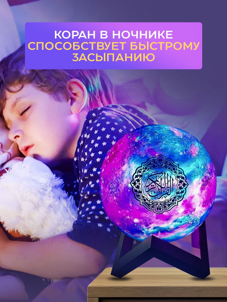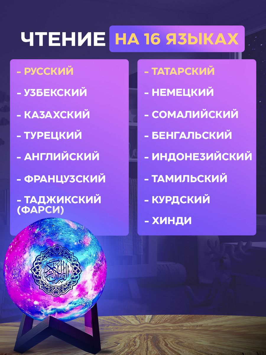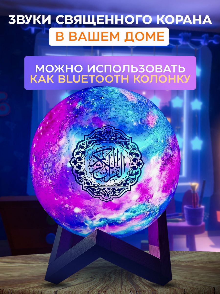 Светильник луна читающий Коран с переводом на 16 языков, в том числе русский, отличный способ наполнить дом теплом, уютом и святым звучанием Корана. Коран ночник читается 16 известными Арабскими чтецами. ПЕРЕВОДЫ: Русский,Фарси(Таджикский),Татарский язык, Узбекский, Турецкий, Английский и др. Управляется Лампа пультом или приложением Quran Speaker в смартфоне. Лампа также проигрывает: Тафсир Корана, Нашиды(мелодии), Сборники Хадисов Бухари и Муслима, Рукъя (Молитвы от сглаза, колдовства, болезней, порчи), Азан Молитвы из намаза, Молитвы Крепость верующего, Арабская Алифба. Комбинированный режим читает Арабский и сразу переводит. Работает как Bluetooth колонка. Зарядка 50мин (моргает зеленым - заряжается, перестал - зарядился) (используя адаптер 5В/2А, в комлпекте только кабель) Ночник читающий Коран отлично подойдет в изучении молитвы намаз, подарок Рамадан, праздник Ураза Байран, Курбан Байрам, Исламские праздники, Мусульманские подарки, Рамадан подарки. Детский ночник, отлично подойдет как подарок для детей. Освещение луной создаст теплую вечернюю обстановку в каждой комнате. А форма светильника луна точно будет интересна как взрослым, так и детям. Лампа космос на подставке. Луна светильник миниатюрного размера, но очень мощная – будет освещать собой всю комнату. Также используется как подсветка для комнаты – у нее 7 разных цветов подсветки. Светильник идет с пультом и кнопкой на корпусе. Ночник коран может длительно время работать на одном заряде – до 10 часов. У корана светильника в комплекте также идет зарядный провод. Светильник космос проектор отличный подарок для детей, мужчин, женщин на день рождения или любой другой праздник. Коран на арабском – мусульманский светильник, такой светильник луна точно понравится каждому, кто верует в ислам.