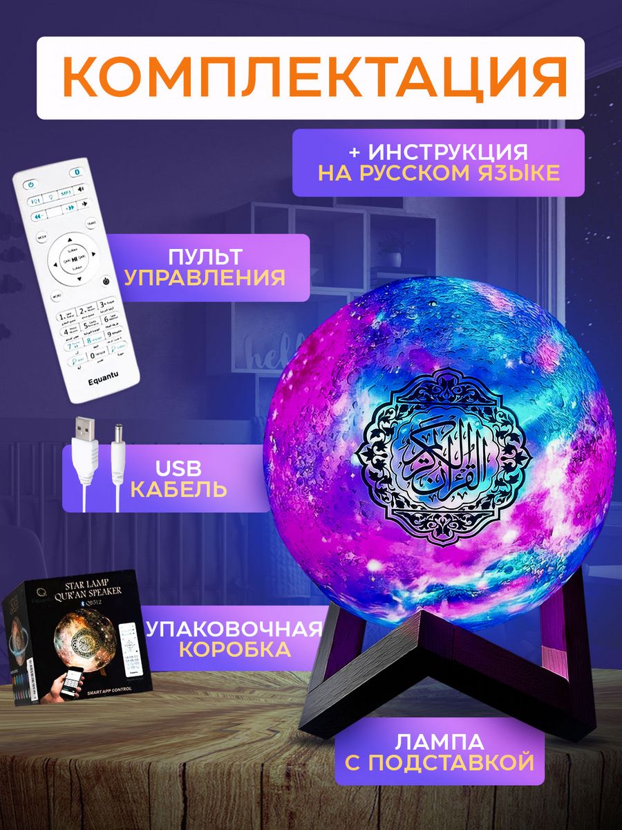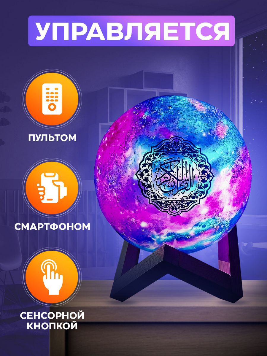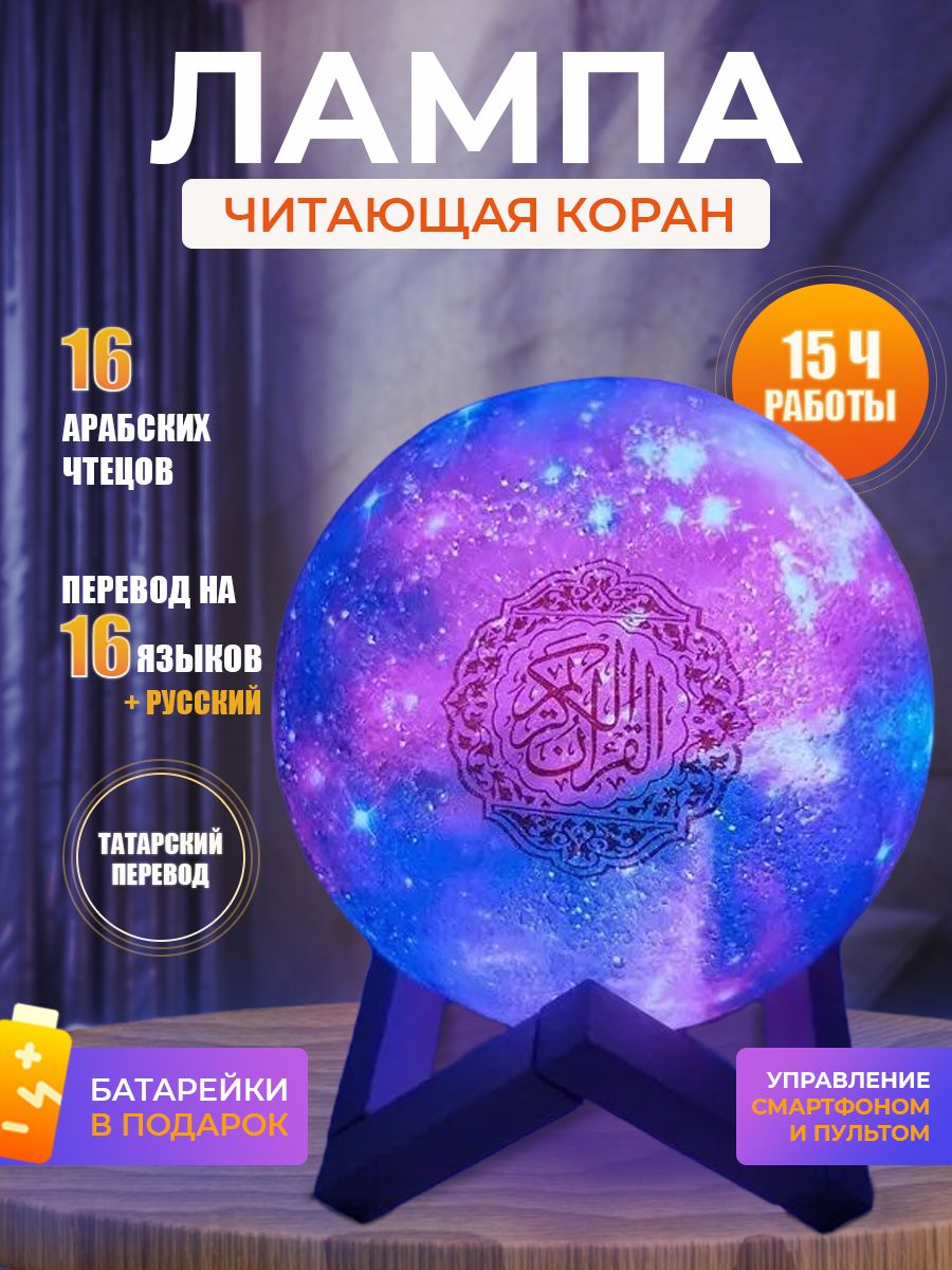 Светильник луна читающий Коран с переводом на 16 языков, в том числе русский, отличный способ наполнить дом теплом, уютом и святым звучанием Корана. Коран ночник читается 16 известными Арабскими чтецами. ПЕРЕВОДЫ: Русский,Фарси(Таджикский),Татарский язык, Узбекский, Турецкий, Английский и др. Управляется Лампа пультом или приложением Quran Speaker в смартфоне. Лампа также проигрывает: Тафсир Корана, Нашиды(мелодии), Сборники Хадисов Бухари и Муслима, Рукъя (Молитвы от сглаза, колдовства, болезней, порчи), Азан Молитвы из намаза, Молитвы Крепость верующего, Арабская Алифба. Комбинированный режим читает Арабский и сразу переводит. Работает как Bluetooth колонка. Зарядка 50мин (моргает зеленым - заряжается, перестал - зарядился) (используя адаптер 5В/2А, в комлпекте только кабель) Ночник читающий Коран отлично подойдет в изучении молитвы намаз, подарок Рамадан, праздник Ураза Байран, Курбан Байрам, Исламские праздники, Мусульманские подарки, Рамадан подарки. Детский ночник, отлично подойдет как подарок для детей. Освещение луной создаст теплую вечернюю обстановку в каждой комнате. А форма светильника луна точно будет интересна как взрослым, так и детям. Лампа космос на подставке. Луна светильник миниатюрного размера, но очень мощная – будет освещать собой всю комнату. Также используется как подсветка для комнаты – у нее 7 разных цветов подсветки. Светильник идет с пультом и кнопкой на корпусе. Ночник коран может длительно время работать на одном заряде – до 10 часов. У корана светильника в комплекте также идет зарядный провод. Светильник космос проектор отличный подарок для детей, мужчин, женщин на день рождения или любой другой праздник. Коран на арабском – мусульманский светильник, такой светильник луна точно понравится каждому, кто верует в ислам.